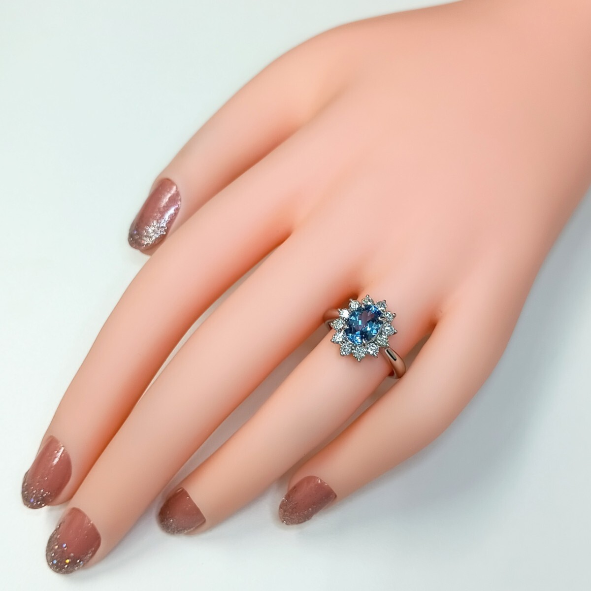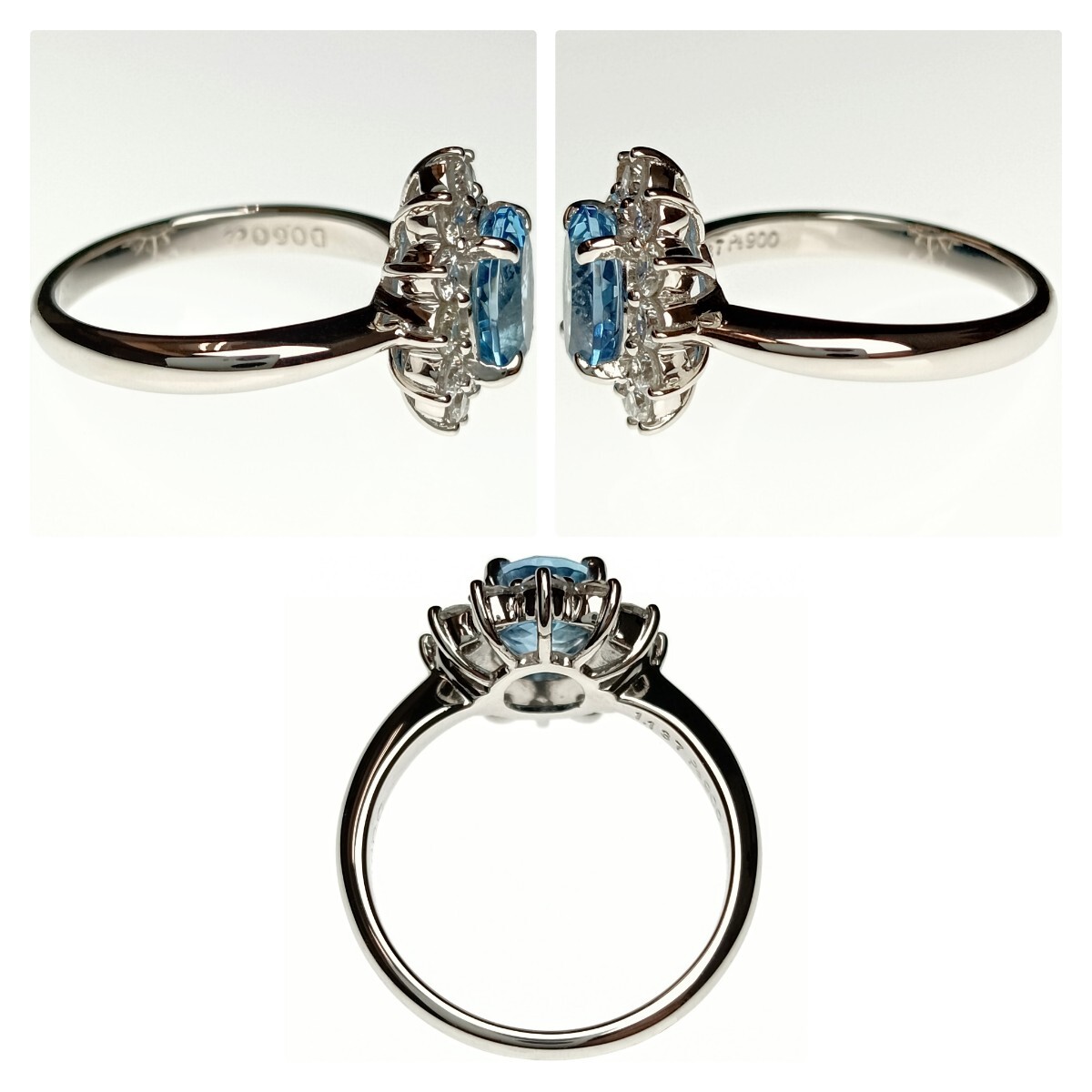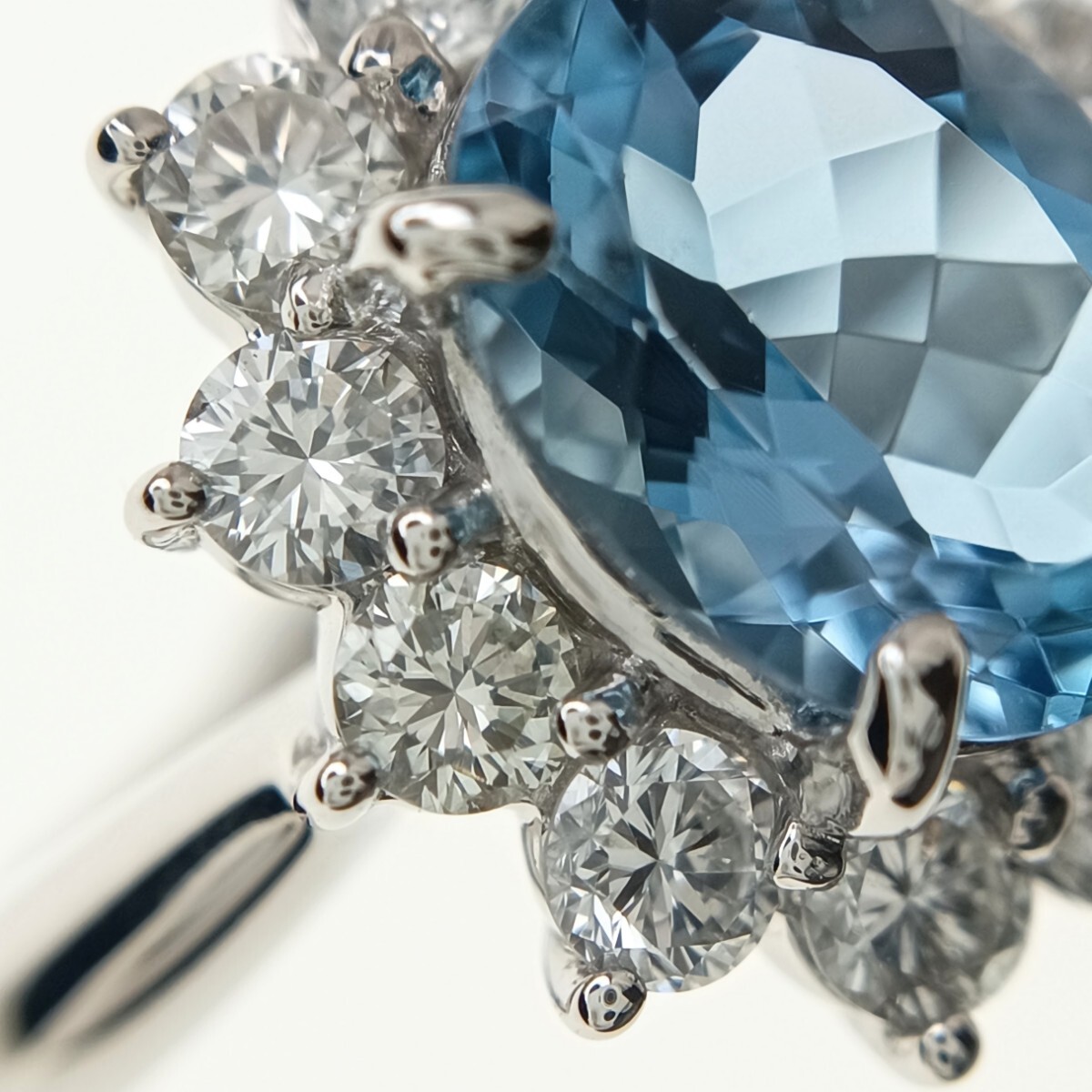 囲うように配された天然ダイヤモンドも無色透明の上質なもので、サンタマリアアクアマリンの美しさをより一層引き立てています。