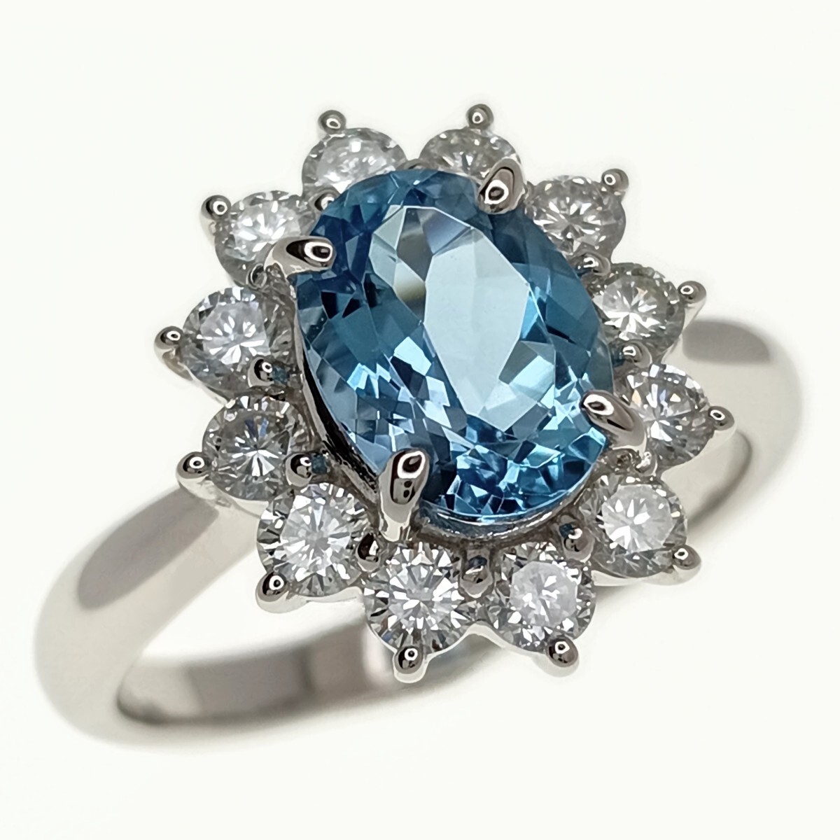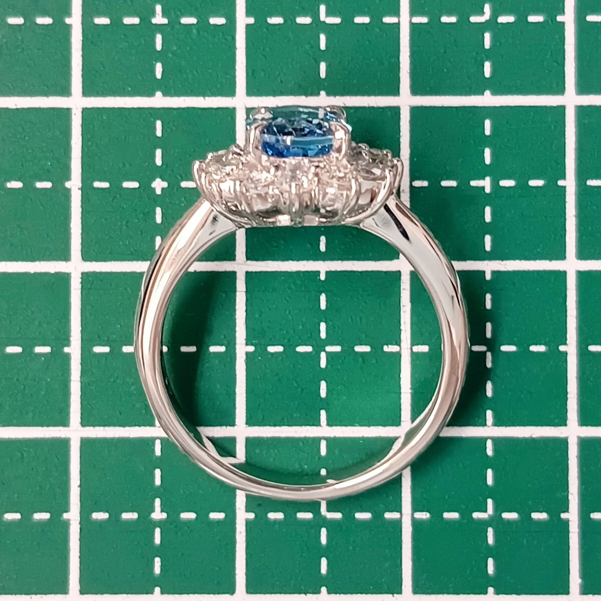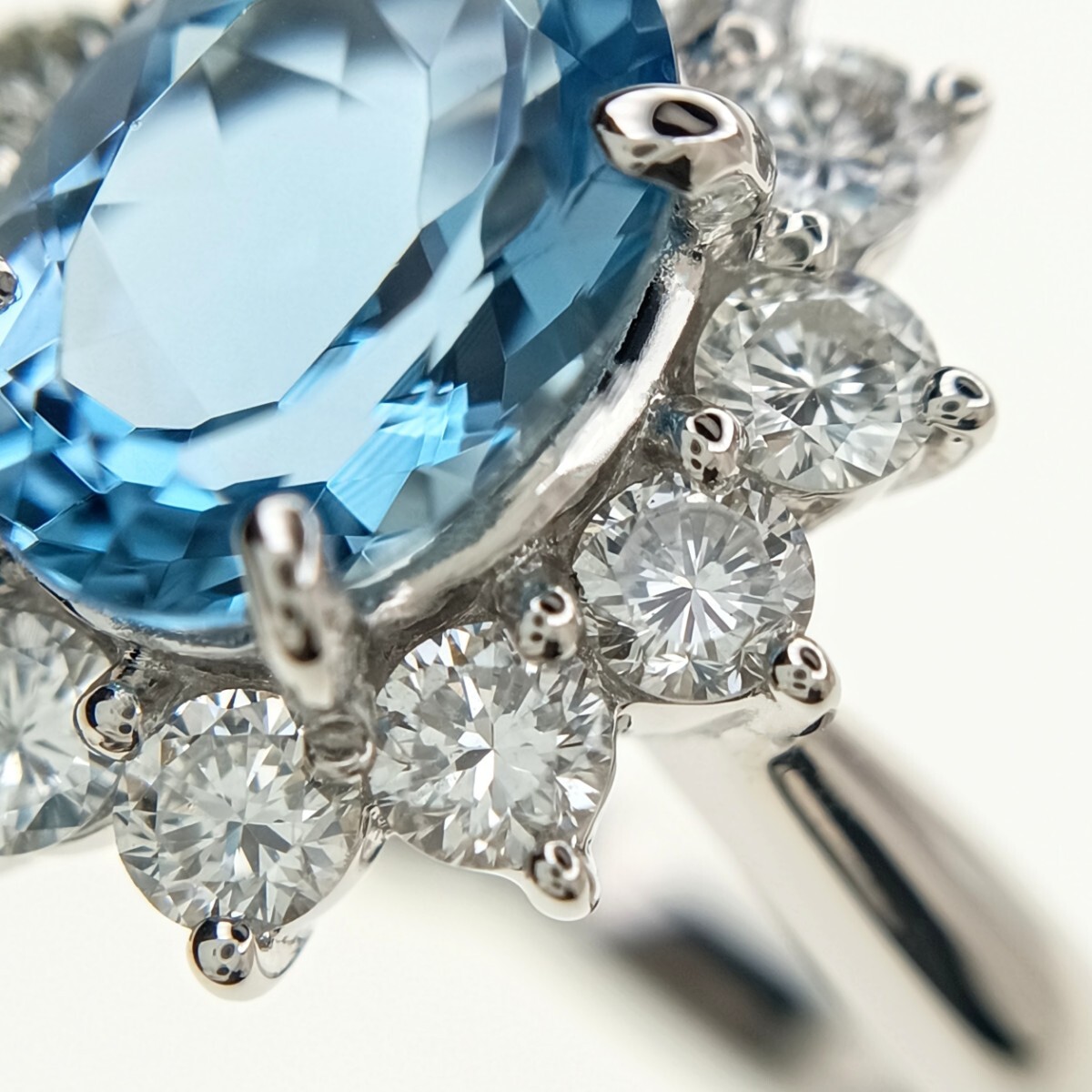 囲うように配された天然ダイヤモンドも無色透明の上質なもので、サンタマリアアクアマリンの美しさをより一層引き立てています。