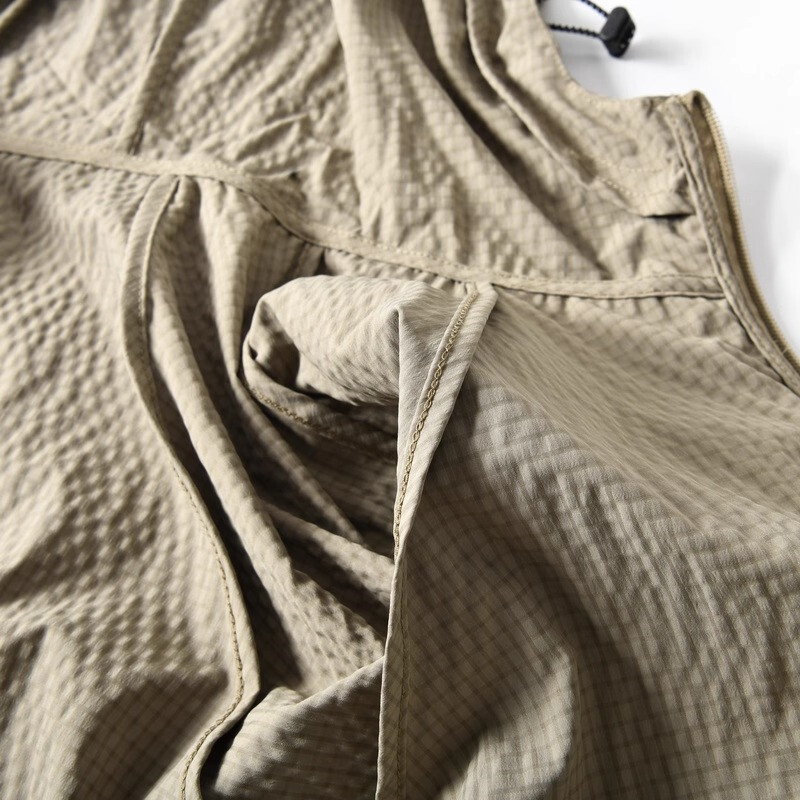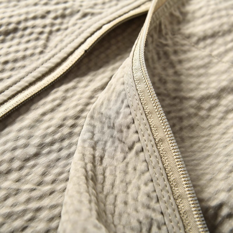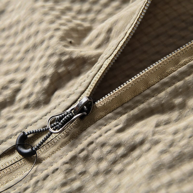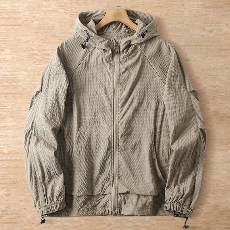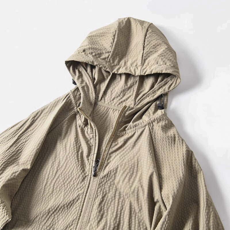 こちらは、春夏にぴったりのメンズ用ジャケットです。シンプルな無地デザインで、泡泡紗(ポコポコとした質感のある軽やかな素材)を使用しており、非常に軽くて通気性に優れています。ゆったりとしたシルエットで、カジュアルに着こなせるのが魅力。フード付きで日差しをしっかりガードし、紫外線対策にもおすすめの一着です。