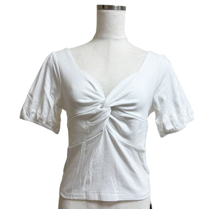襟ぐりが広めにあいていて、胸もとはひねりデザイン。
