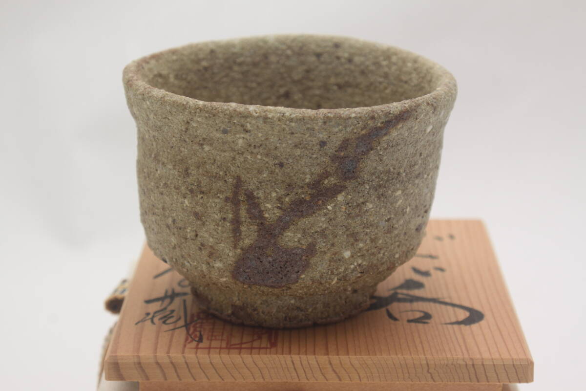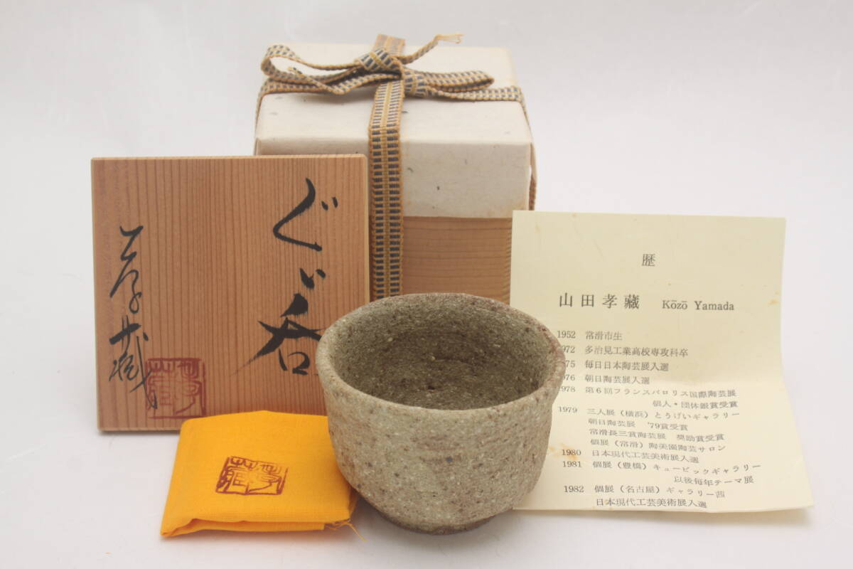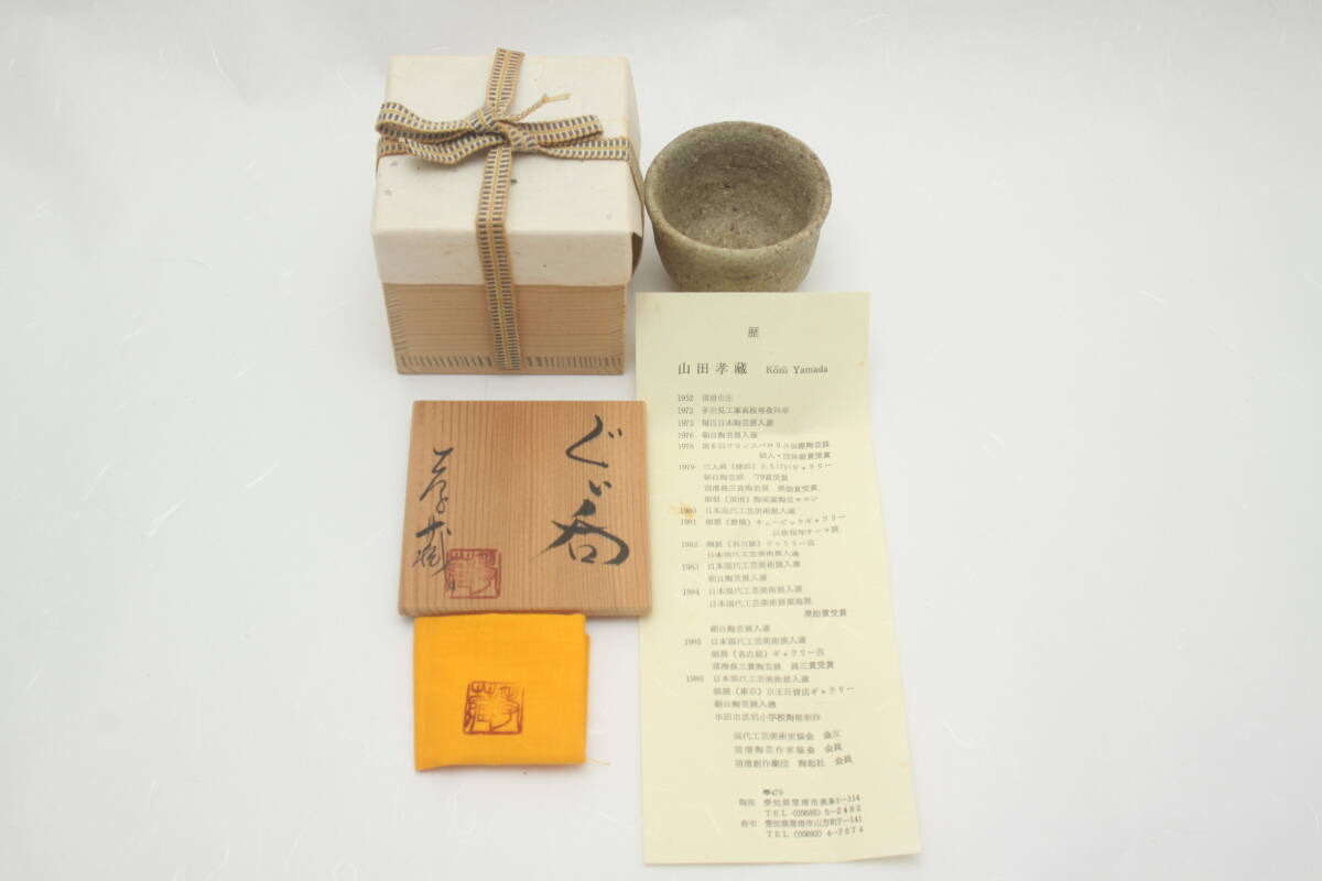 3576 新品未使用 昭和63年 常滑焼 伊羅保釉 草文 山田孝蔵 ぐい呑 酒器 共箱 共布 栞