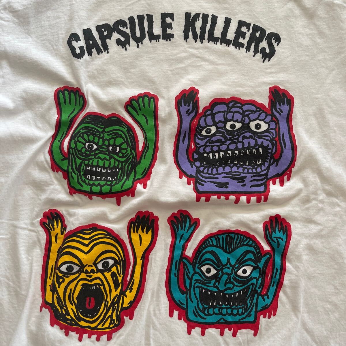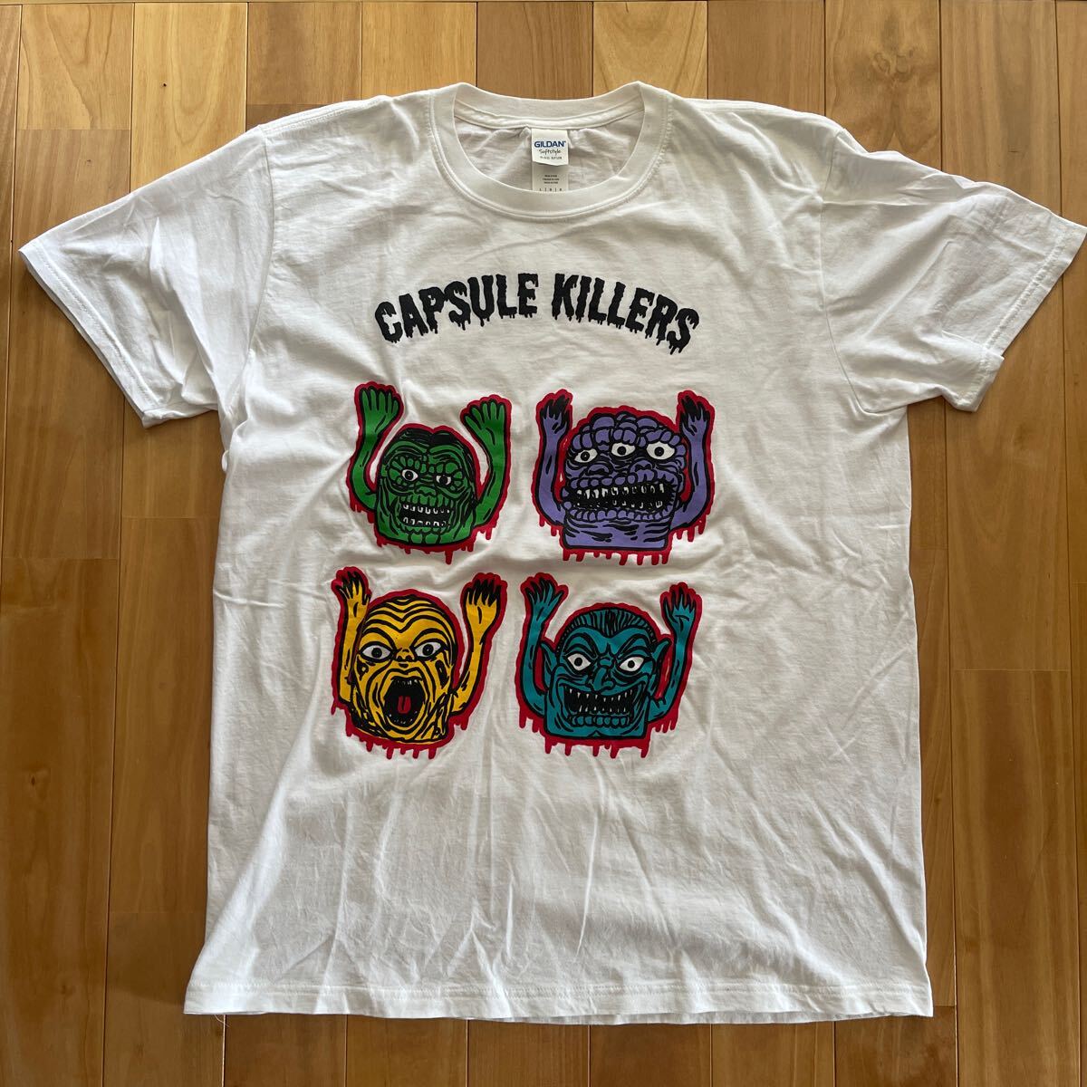 名前は忘れてしまいましたが、数年前に海外のサイトにて購入しました。使用回数は数回ですので状態は良いです。着丈が長かったので洋服のお直し店にて短くしています。マテルのゾンビーズ風でもあり、明治製菓のジャンケンモンスター風でもある、変わったデザインになっています。レトロな日本文化が好きな外人特有の解釈だと思います。海外のGILDANのLサイズですので日本のXLぐらいあります。