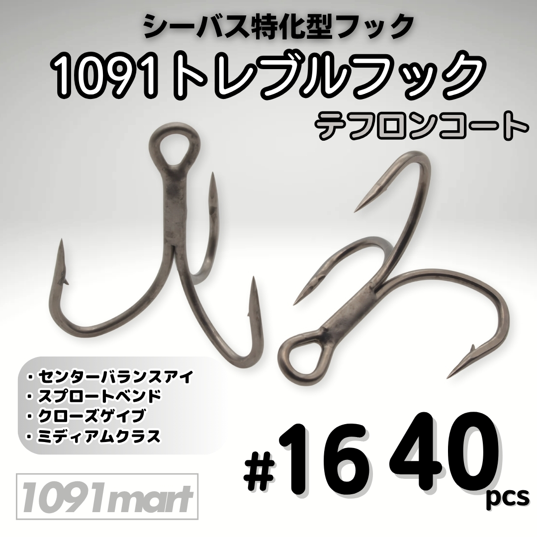 1091トレブルフック テフロンコート #16 40本セット 刺さり重視 バラしにくい シーバス特化型 トリプルフック ルアーフック【1091mart】