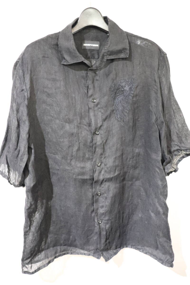 即決 EMPORIO ARMANI エンポリオアルマーニ 不死鳥 フェニックス刺繍 半袖リネンシャツ ボックスシャツ メンズ 42 16 1/2 黒 ブラック