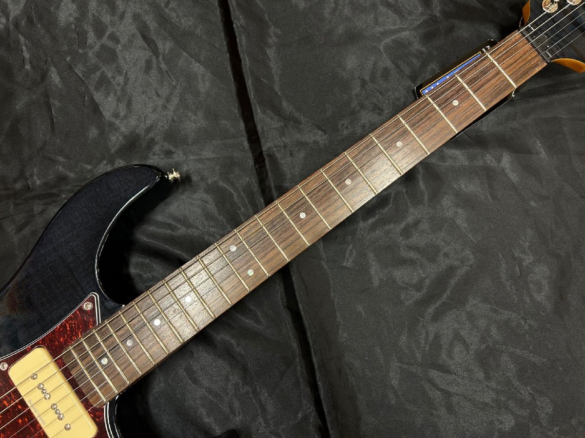 ピックアップはフロントにSeymour Duncan社製のSP90-1を、リアには同社製のカバードハムバッキングCustom 5を搭載。ボディトップ及びヘッドに美しい杢目のフレイムメイプルを配し、新フィニッシュ「ダークレッドバースト」を含むシースルーカラー3色をラインアップ。ブリッジにはWilkinson社製VS-50を搭載しスムーズなアーミングを実現しました。