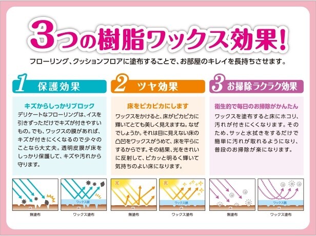 デリケートの床は傷つきやすいもの。ワックスの膜があれば、傷がつきにくくなるので少々のことなら大丈夫。透明皮膜が床をしっかり保護して、キズや汚れから守ります。
