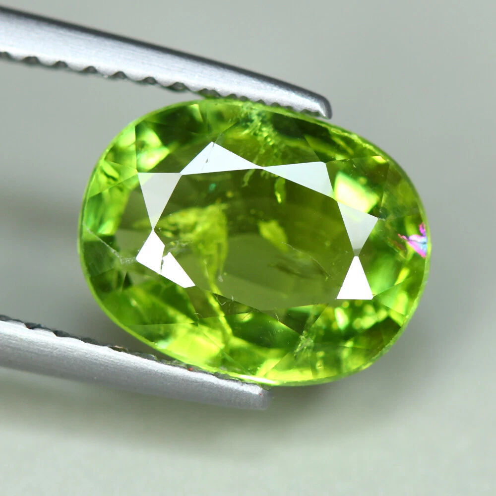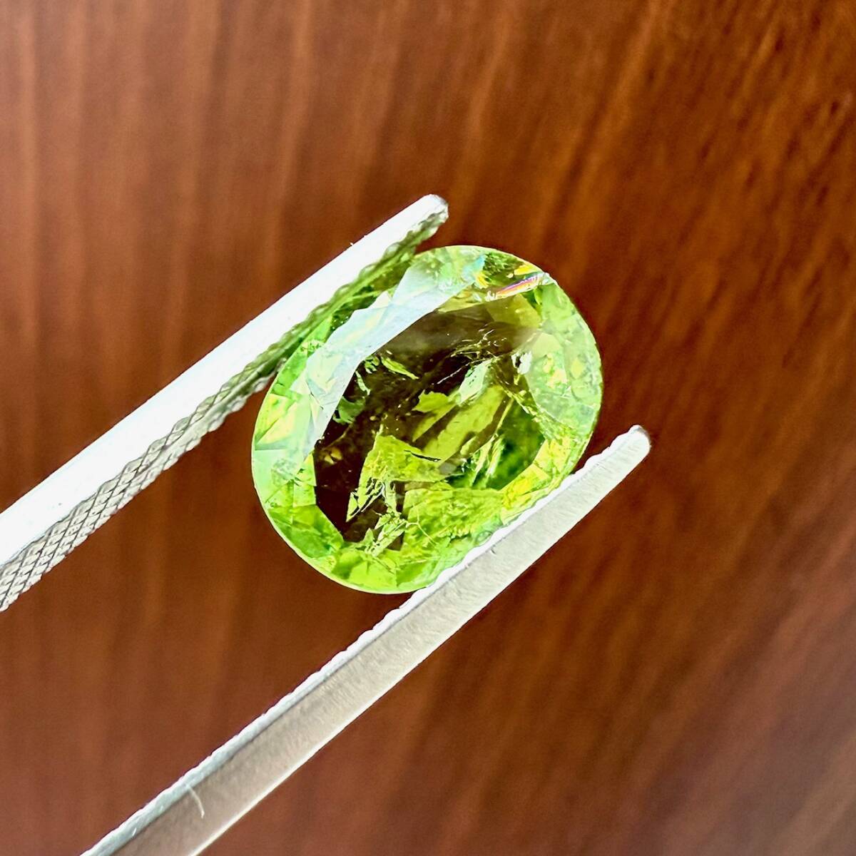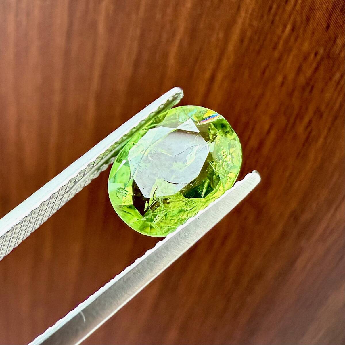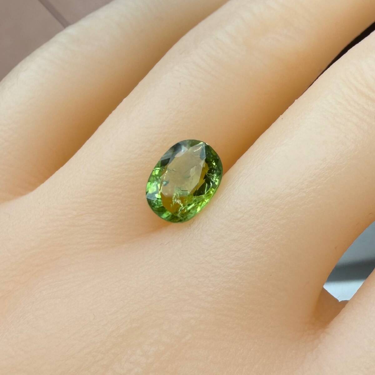 キラキラ虹入りのグリーントルマリン。2.61カラットもある大粒サイズ。天然トルマリン特有のインクリュージョンはありますが、カット面も美しく、艶とテリ(輝き)もあるみずみずしいルースです。