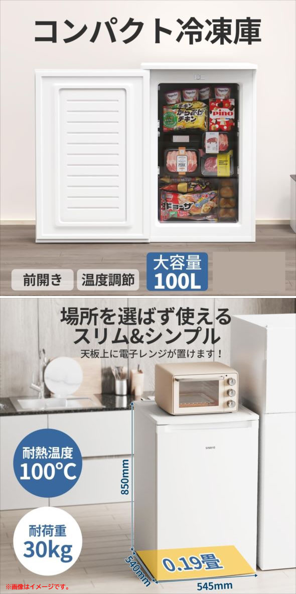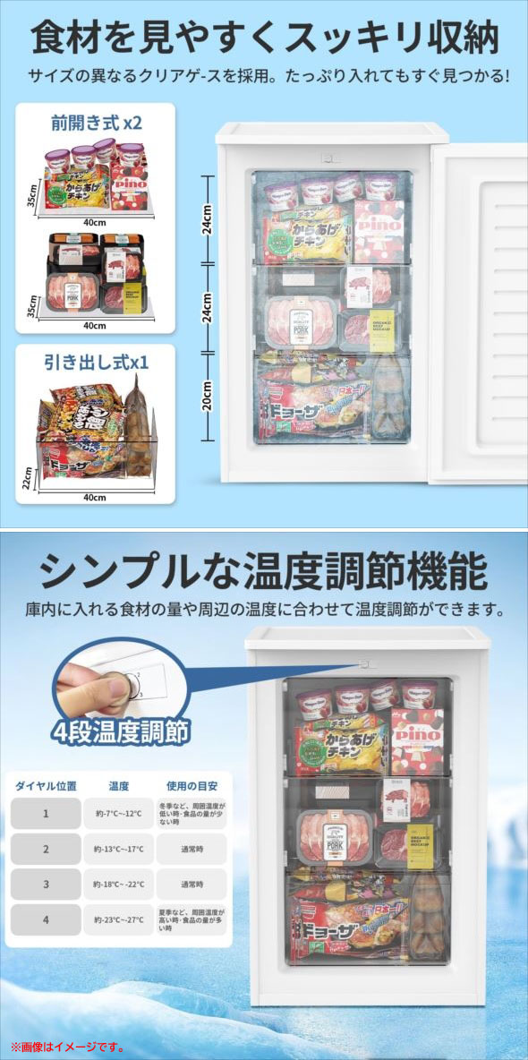 【商品特長】 ◆大容量設計、便利な分類収納 容量100Lで、3つの透明トレーが付属しています。一目で庫内の食品を確認でき、整理整頓しやすい設計です。 大容量でありながら、食品の取り出しも簡単で、日々の利用に便利です。 ・前開き式ケース×2 奥にある食材もスムーズに取り出せます。また、蓋付きなので雑菌やホコリの侵入を防ぎ、 扉の開閉によって庫内温度をしっかりキープします。 ・引き出し式ケース×1 中身が一目で分かり、簡単に取り出せます。外気の侵入を抑え、冷気が外に漏れにくい設計です。 ◆4段階温度調整&急速冷凍 4段階の温度調整が可能で、2時間で急速冷凍ができます。3D冷風循環システムを搭載し、庫内全体を均一に冷却。 肉や魚などの細胞破壊を防ぎ、風味や栄養素の損失を最小限に抑えます。 冷凍後も鮮やかな色合いと美味しさを保つ優れた性能を提供します。 ◆耐久性と静音性の両立 上部は最大30kgの荷重に耐え、電子レンジや調理家電を設置可能。トレーは耐熱温度100℃まで対応し、 長期間使用しても変形しにくい高耐久設計です。さらに、動作音はわずか26dBと非常に静かで、 リビングや寝室でも快適に利用できます。 | |||||||||||||||||||||||||||