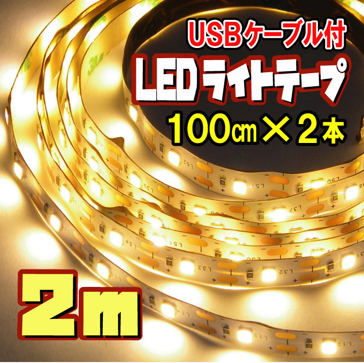 ☆ LED テープ ライト[1メートル×2本セット] USBケーブル付 間接照明 切断可 裏面テープ / 電球色 2メートル(1m×2本) 【匿名配送】
