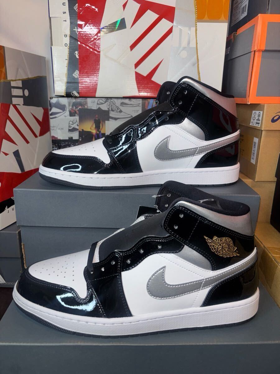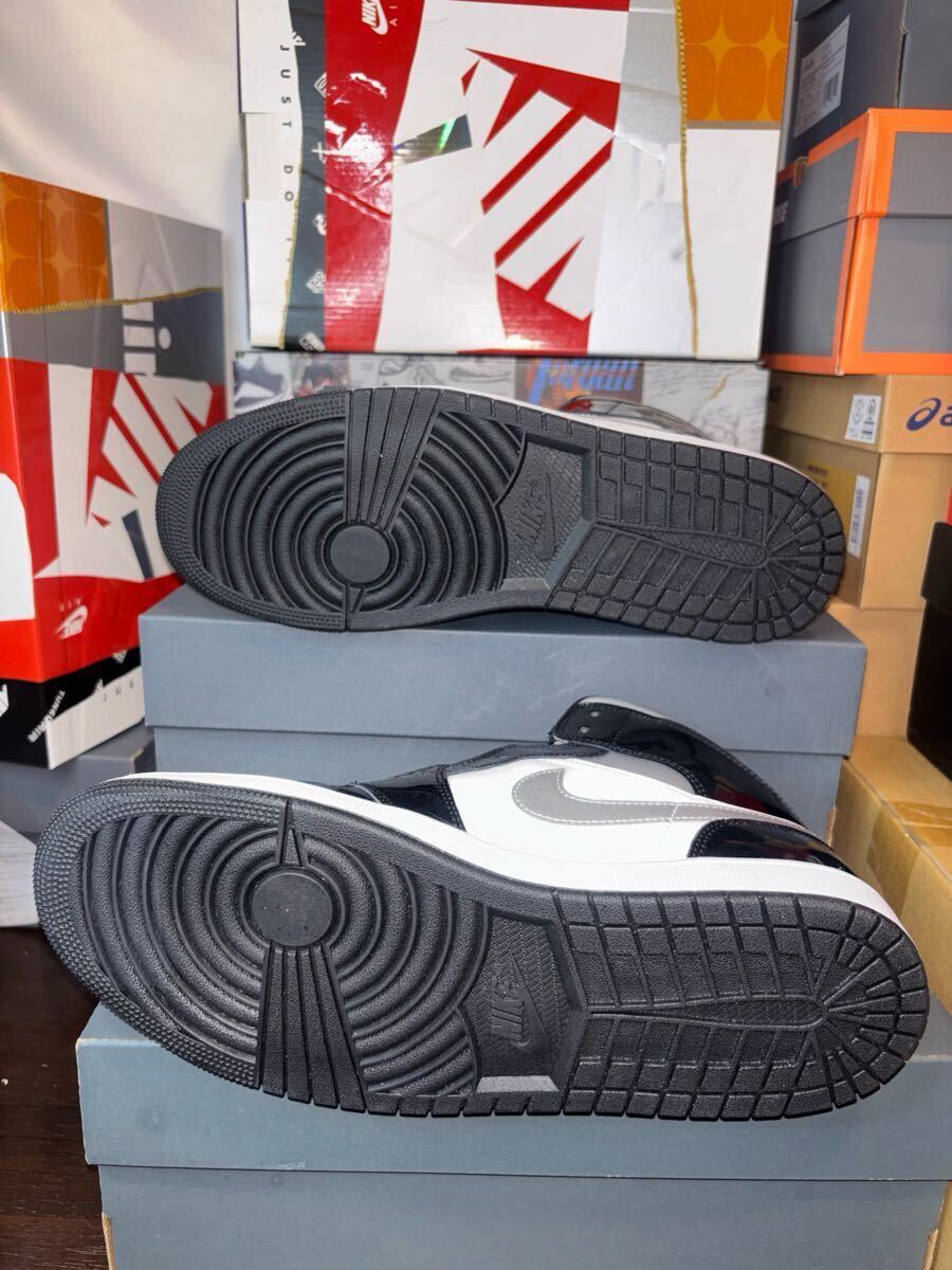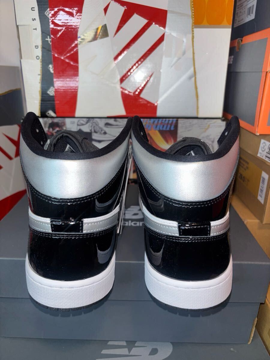 このAJ1は 人目を引くデザイン。 光沢のあるエナメルレザーで、輝きと高級感をプラスしました。シルバーのアクセントがラグジュアリーなスタイルを演出するデザインです。