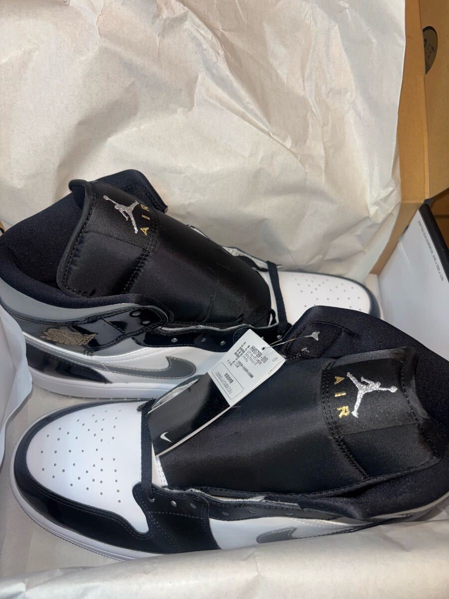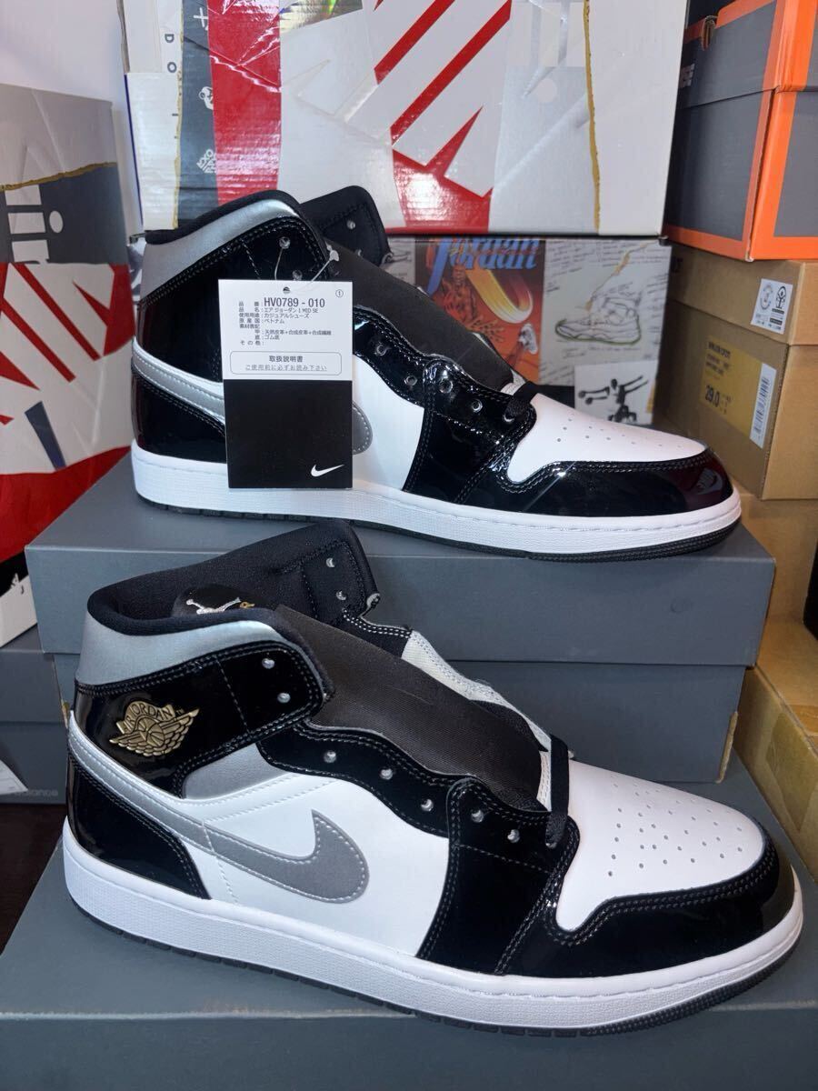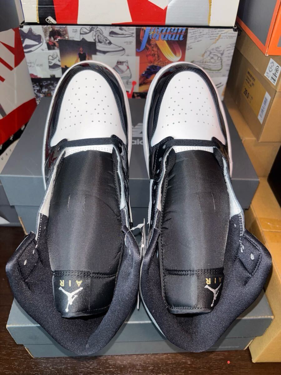 このAJ1は 人目を引くデザイン。 光沢のあるエナメルレザーで、輝きと高級感をプラスしました。シルバーのアクセントがラグジュアリーなスタイルを演出するデザインです。