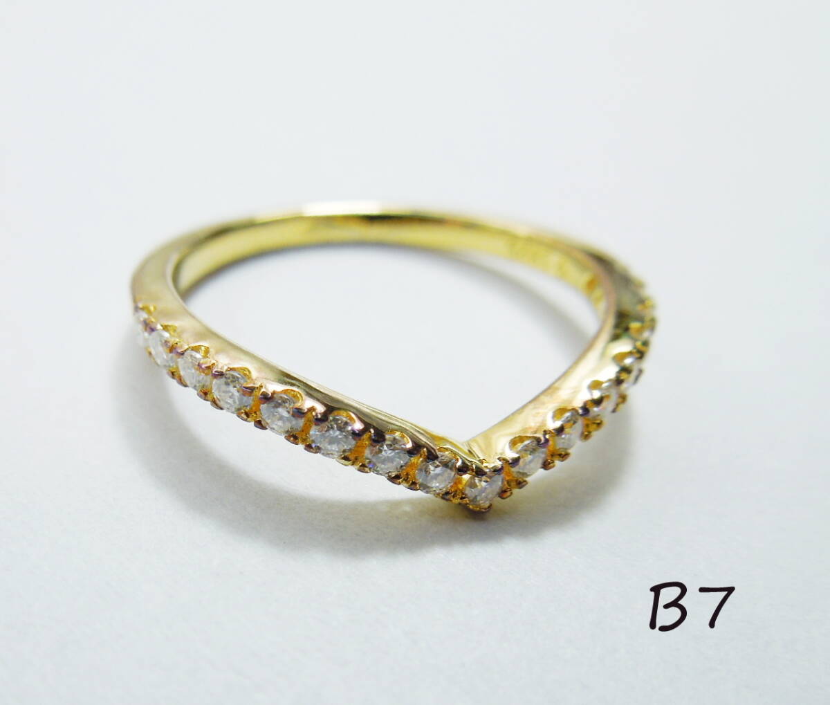指輪の半分にストーンがあしらわれたデザインになります。 V字リングの為、指がスッキリ見えます。