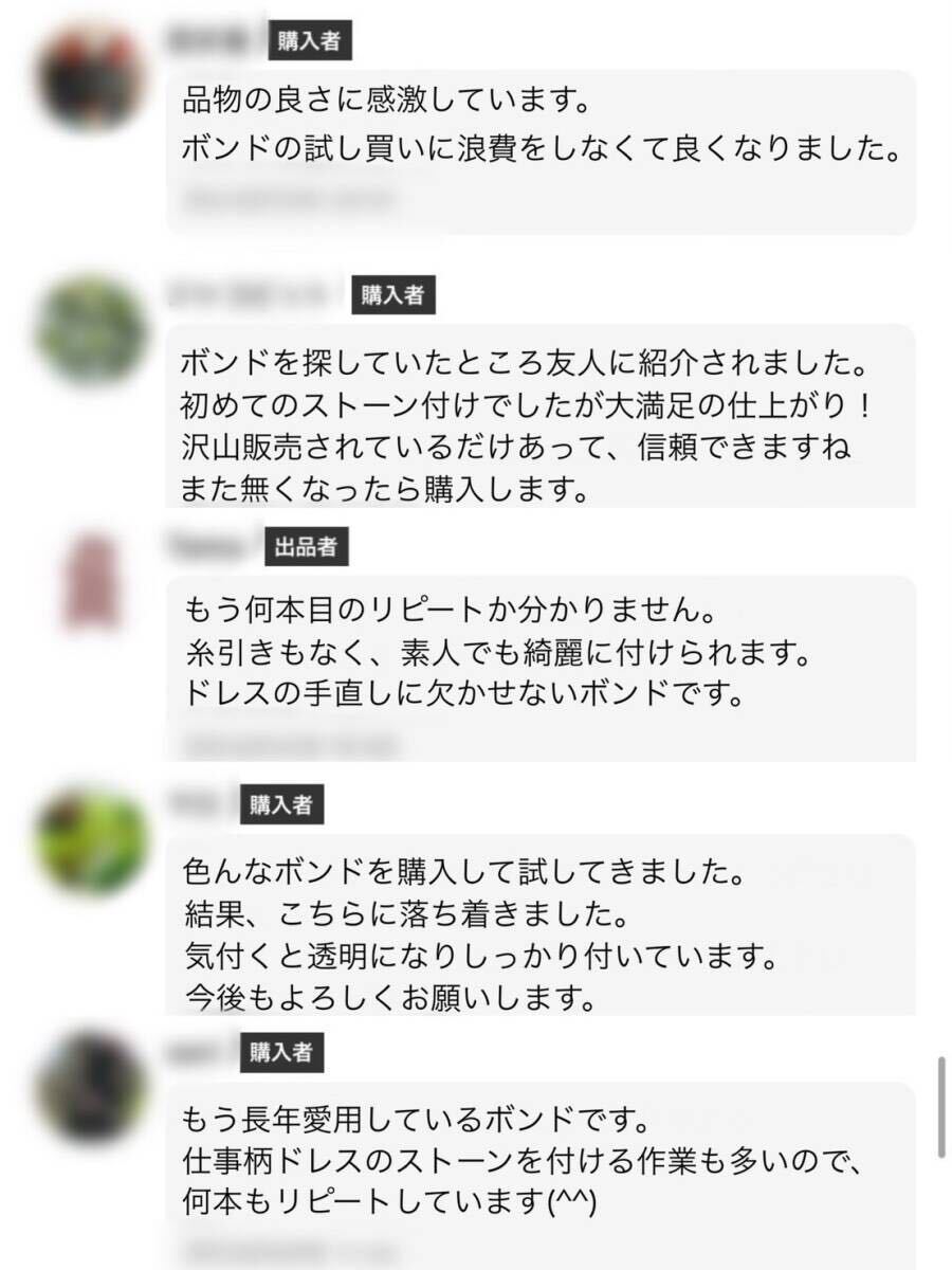 15年以上石付け作業をしており、いろいろ試した結果、このボンドが一番使いやすく、生地を傷めず綺麗に仕上がります。