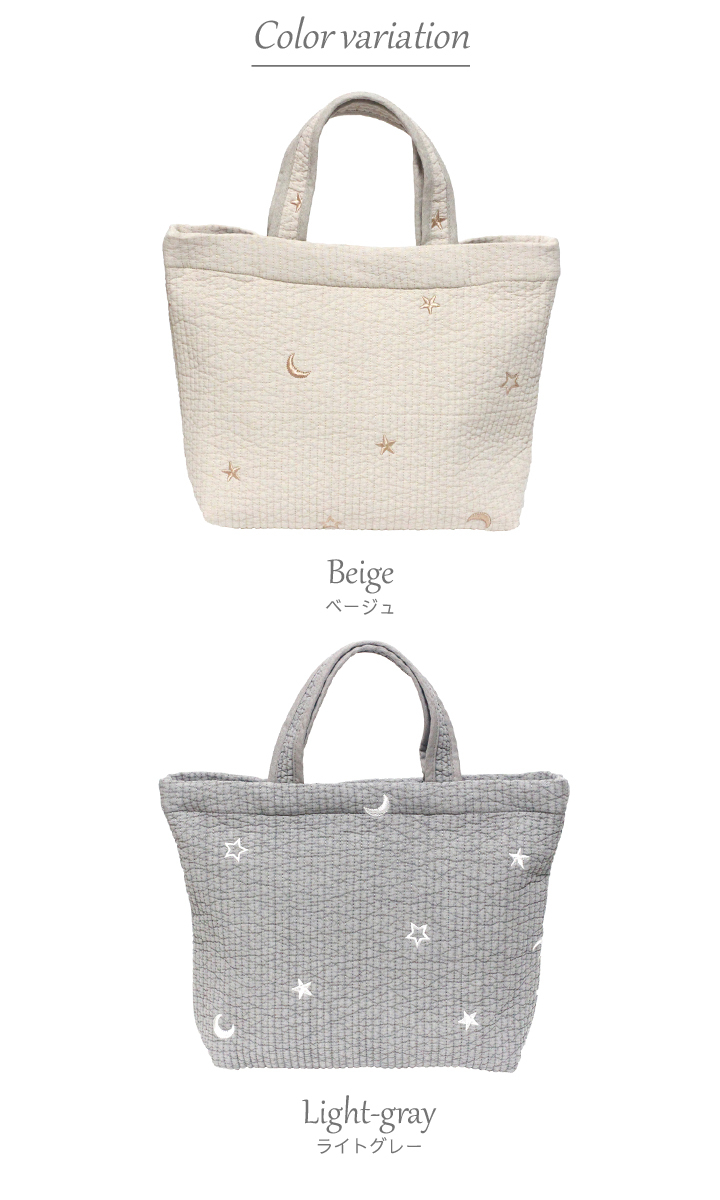 商品説明 | 『ヌビバッグ』とは?! ヌビとは韓国語でキルティングしたものを意味します。 そのキルティングの生地で韓国の布団であるイブルを作ることからイブルバッグとも言います。 ◆特徴◆ やわらかく肌触りが抜群! 軽くて肩コリ知らず! 洗える生地なので清潔! 星と月の刺繍が可愛らしいトートバッグです。 ナチュラルカラーですので、どんなファッションにもマッチします♪ Mサイズは、A4サイズのファイルや500mlペットボトルは余裕で入る大きさいです。 持ち手が36cmで肩がけもできますので、長時間のお出かけもOK!! *柄の出方は掲載画像と相違がございますので予めご承知おきくださいませ。 |