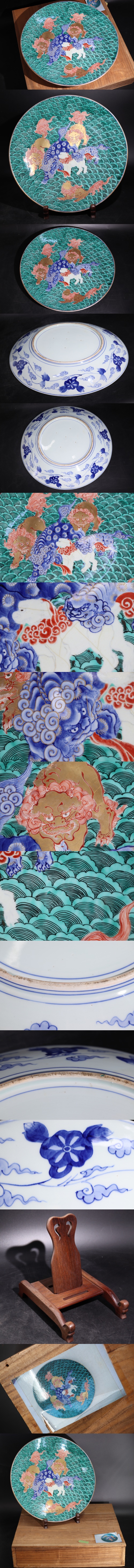 | 時代 有田焼 色絵 獅子図 大皿 台座・木箱付 / 金彩 飾皿 皿 茶器 煎茶道具 煎茶飾 .G1971 |