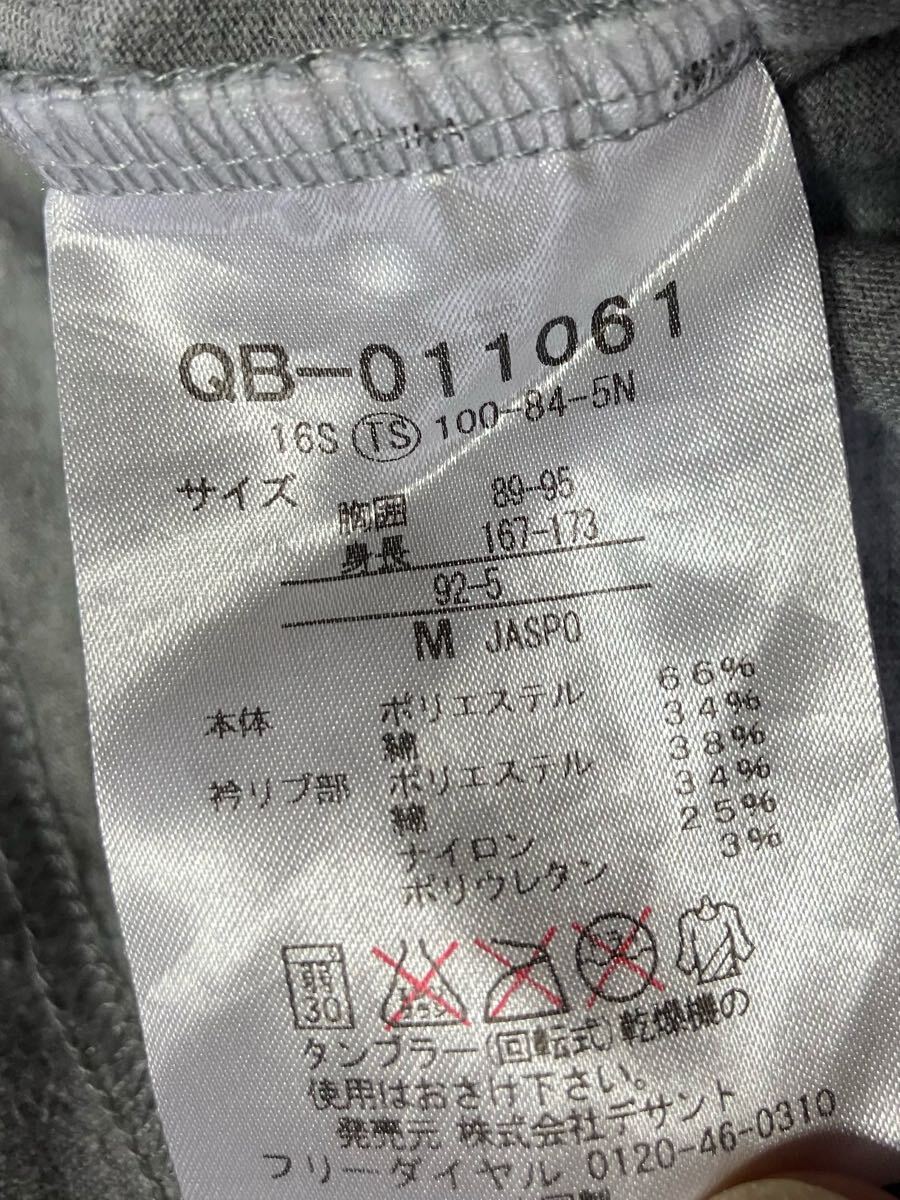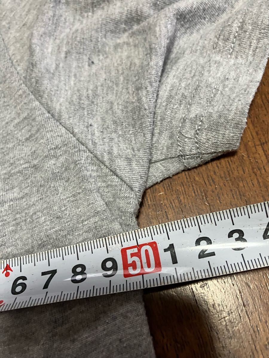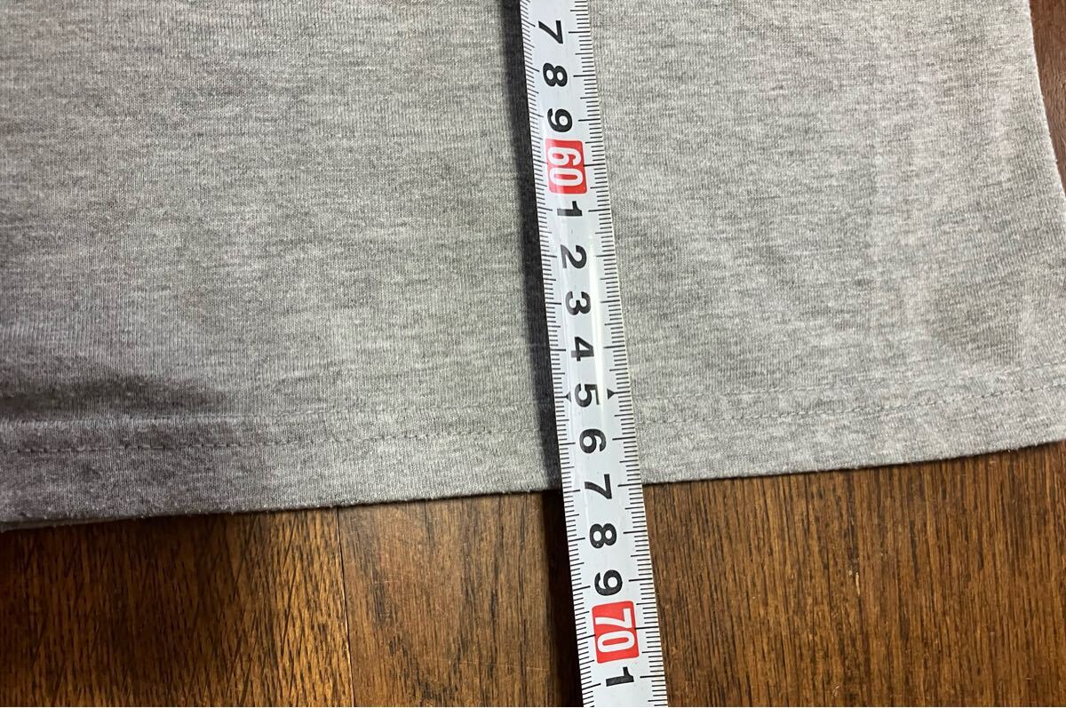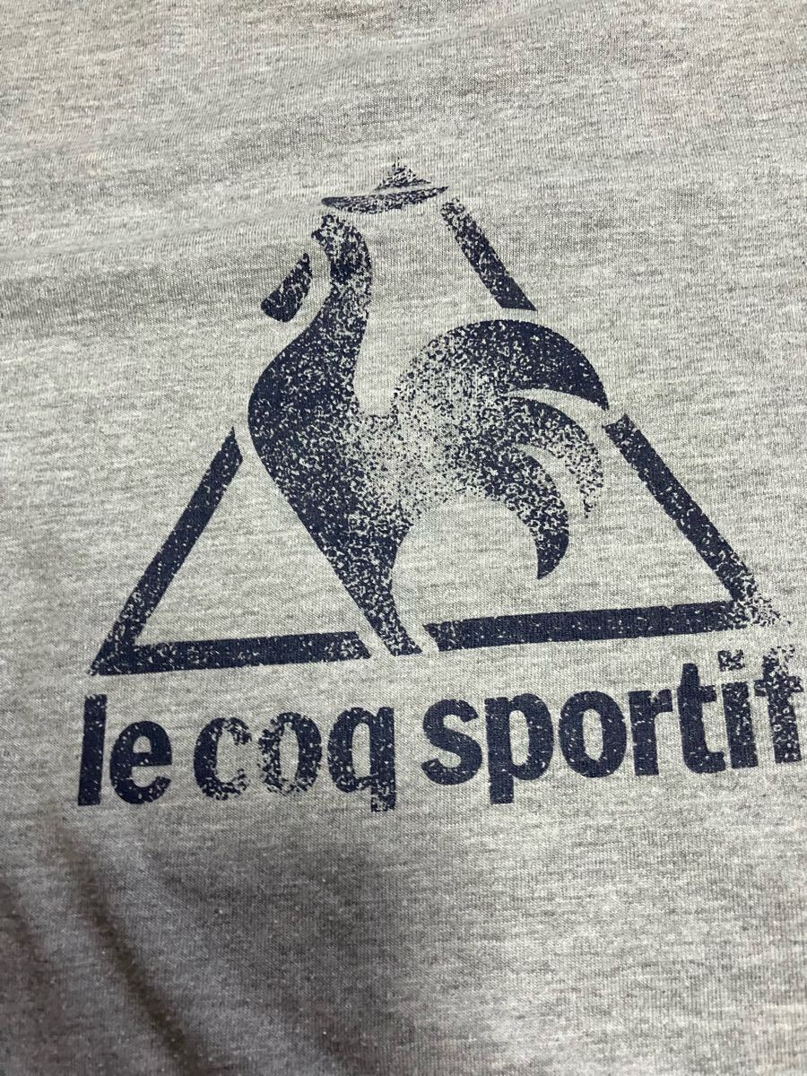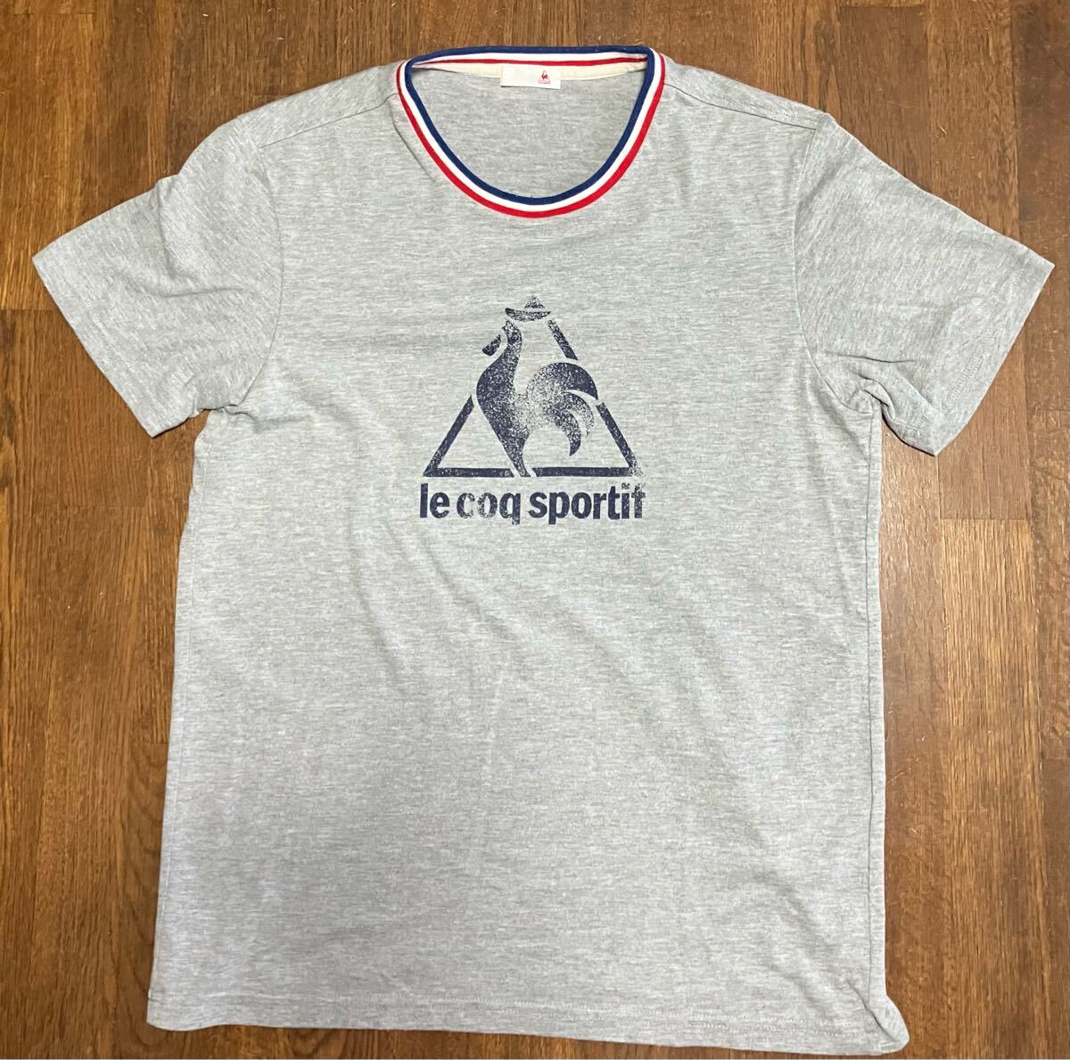 グレーのコットン混紡Tシャツ、トリコロールカラーの襟とロゴプリントが特徴。