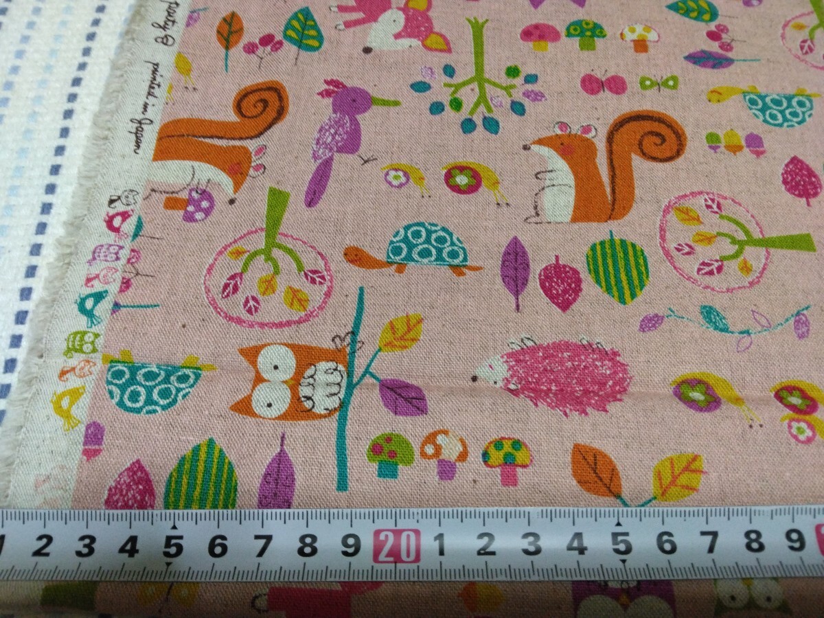 フクロウやリスなどの可愛いアニマルパーティーの綿麻生地です。