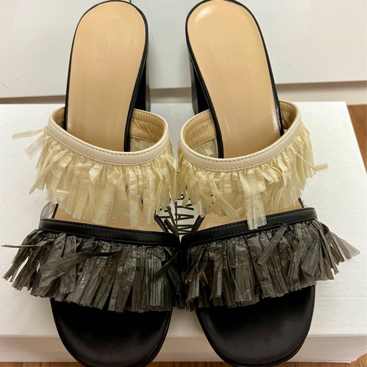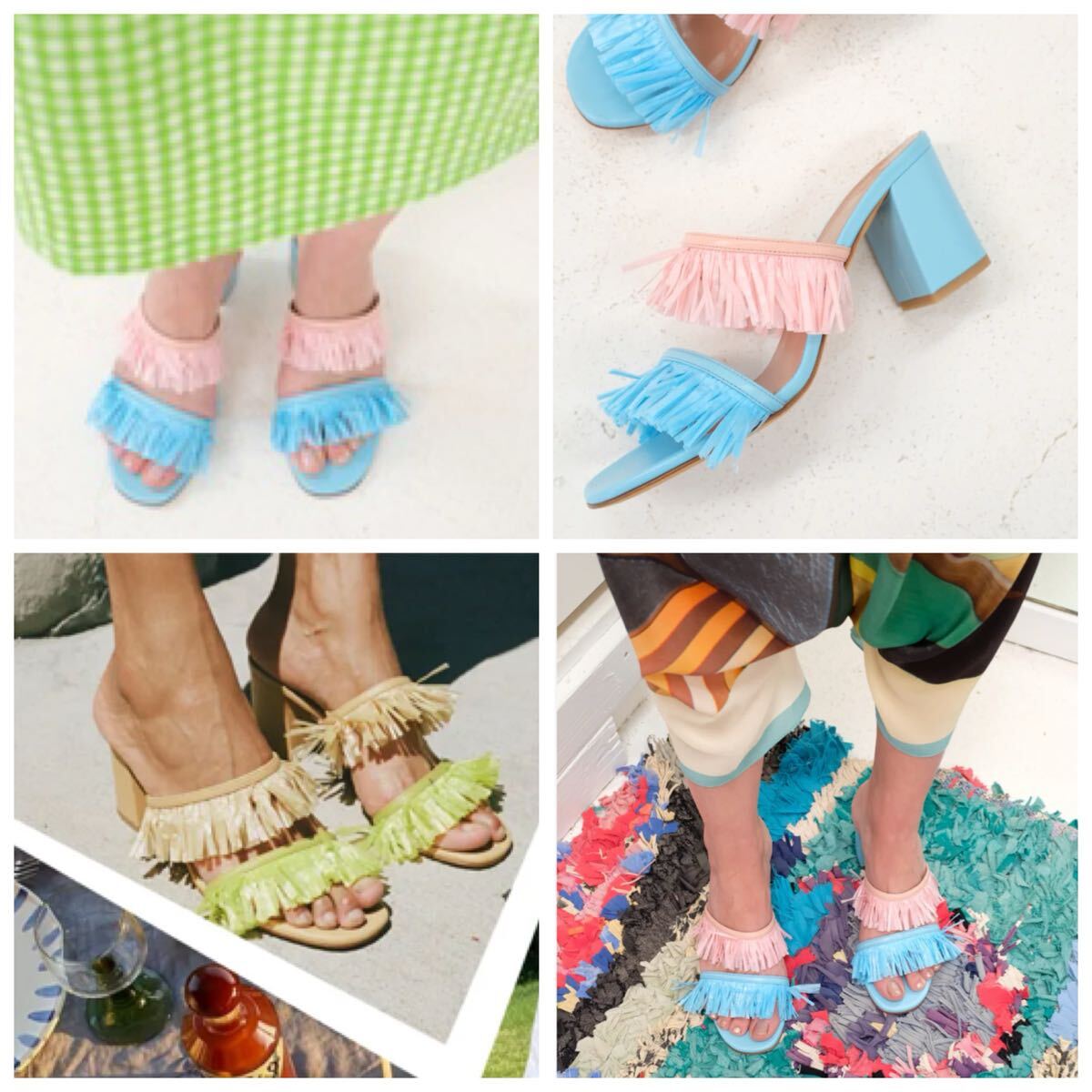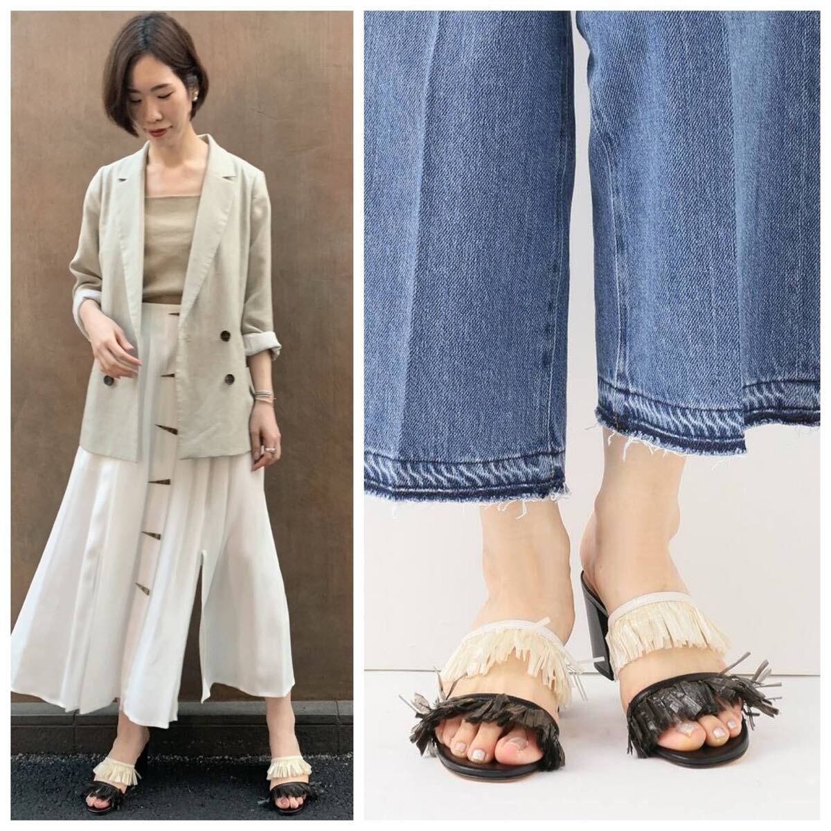 * フリンジが揺れるオープントゥミュール:で軽やかなフリンジが足元に動きを加え、リゾートシックな雰囲気を演出します。