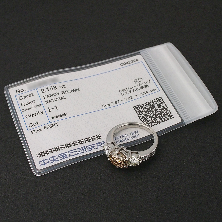| 状態/備考 | センターダイヤのカラーは【FANCY BROWN】クラリティ【I-1】 仕上済 ※商品に対してご不明点等がございましたら、質問欄よりご連絡ください。 ※石のサイズ記載が無い場合は刻印無しの為サイズ不明扱いとさせていただいております。 |