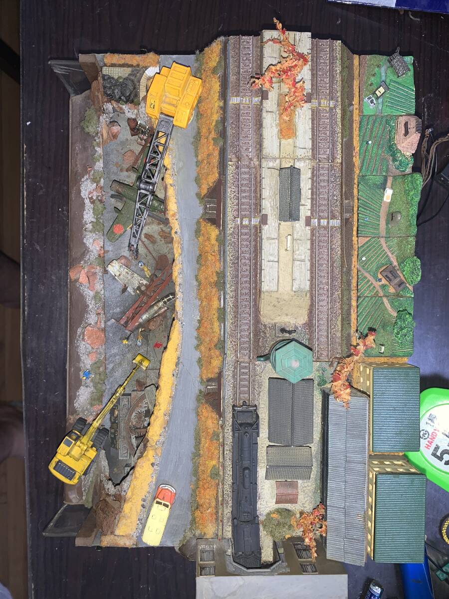 クレーンとショベルカーは恐らくトミカを加工等した物だと思われます。