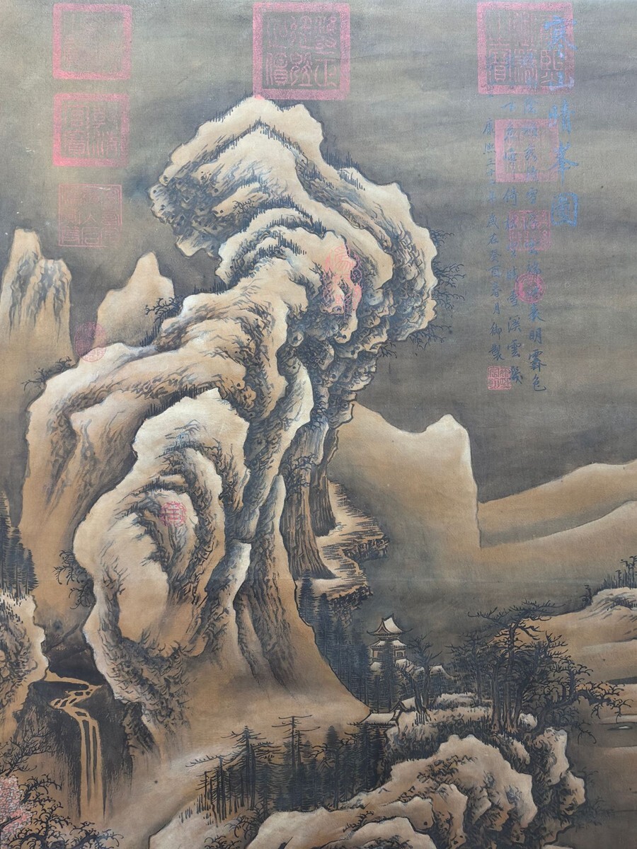 中国書画「大清聖祖康熙大帝御製 寒山晴峯図」肉筆絹本 掛け軸 墨寶妙品 書画立軸 巻き物 古美術 旧蔵出