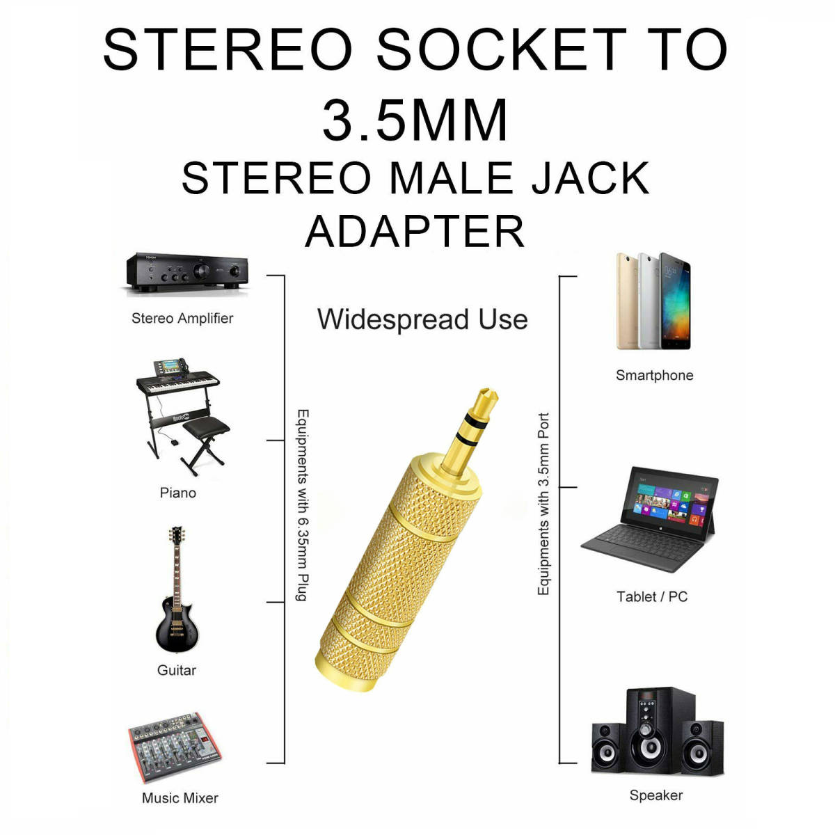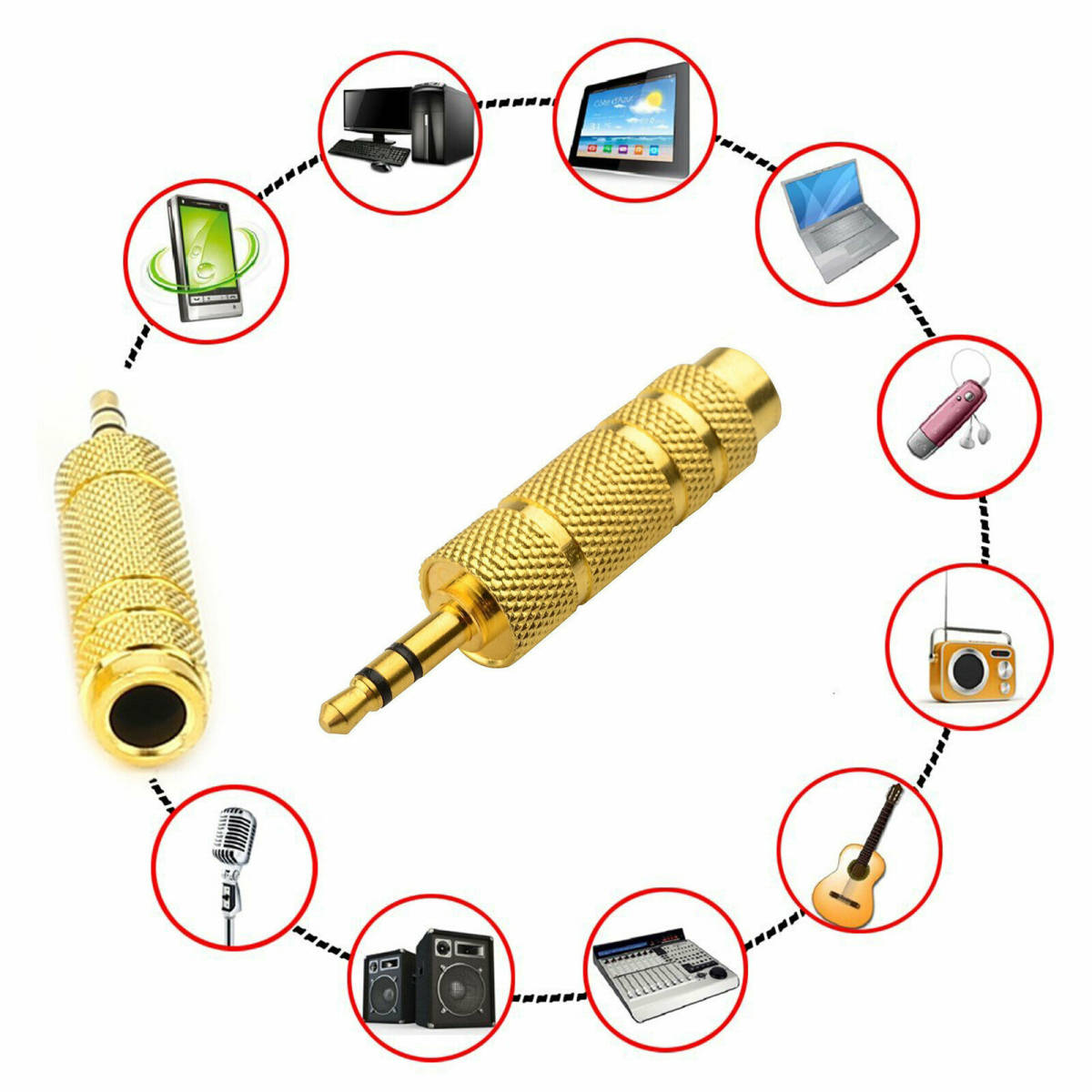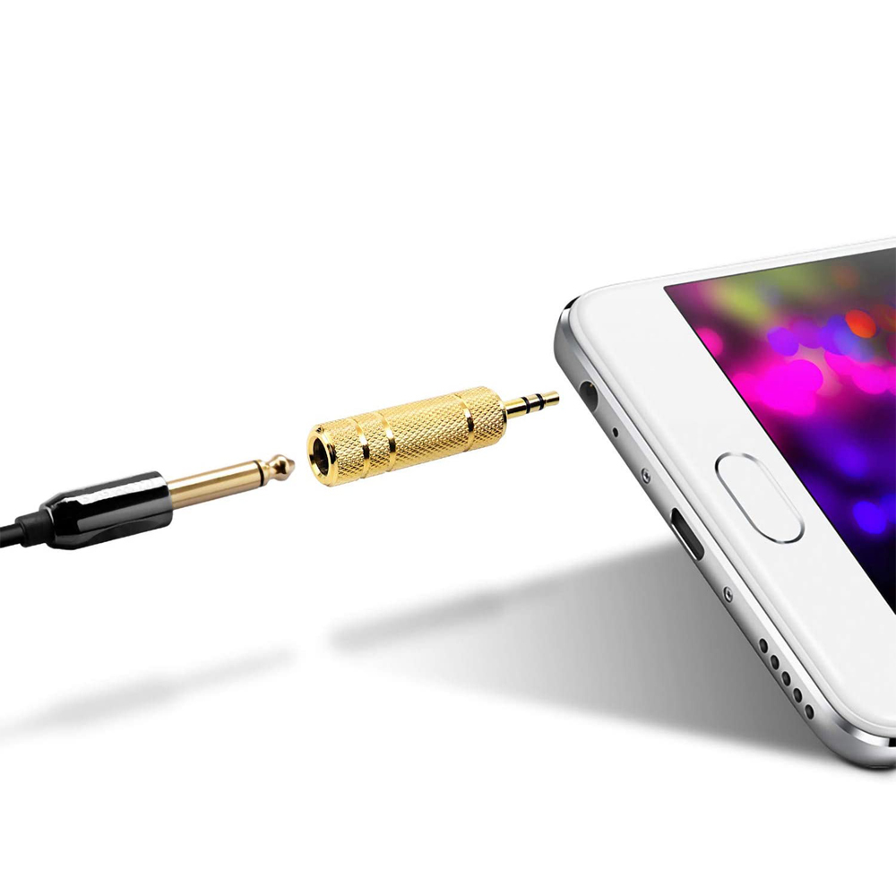 特徴 ・3.5mm(1/8 インチ)プラグが付いているスマホ、タブレット、iPod 、ヘッドフォン等を6.35mm(1/4 インチ)のステレオジャックが搭載のオーディオデバイスと接続することができます。