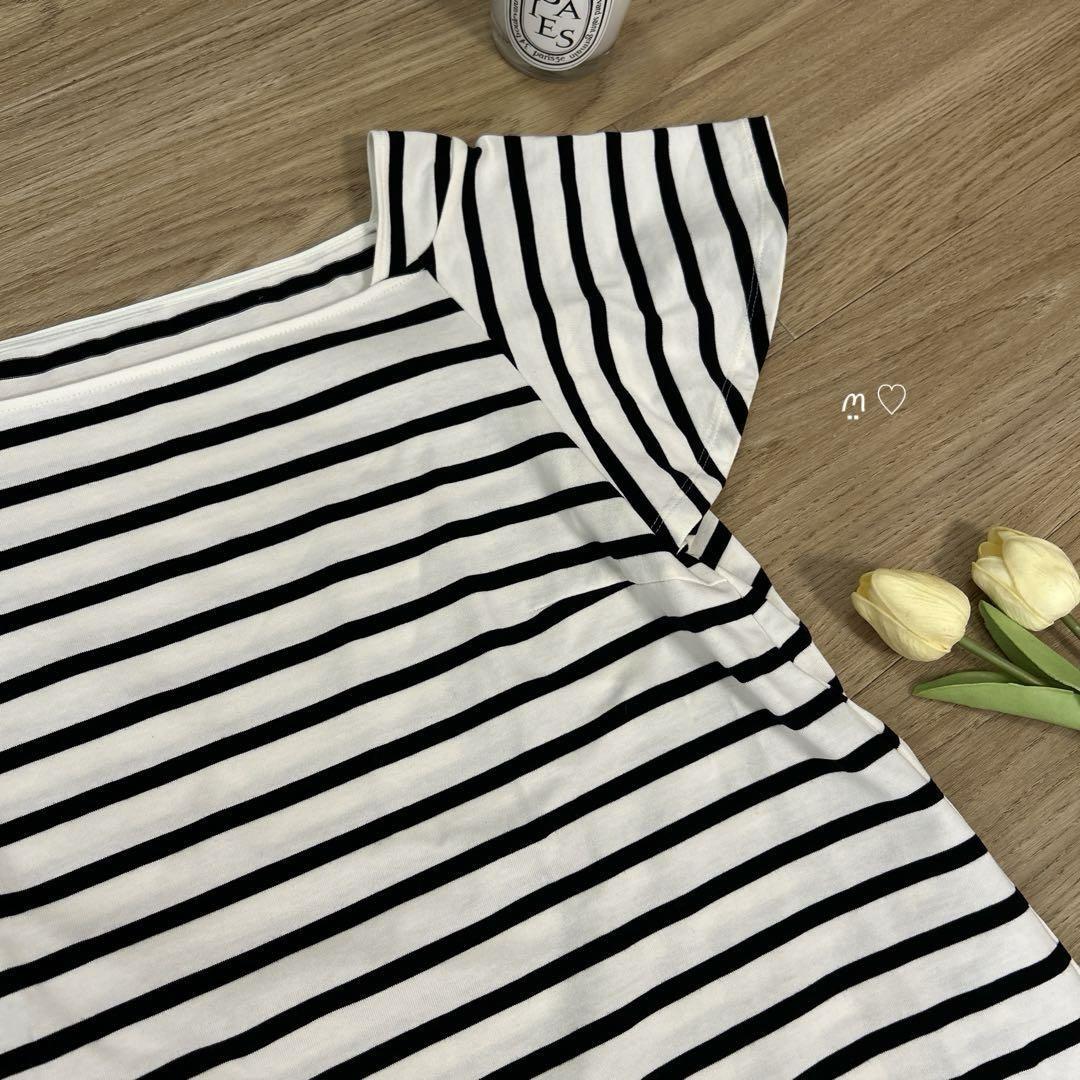 ボーダー柄ながら洗練された印象で、カジュアルすぎず品のある装いに。