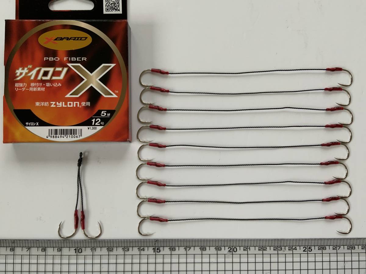 針:          ヒラマサ10号 シルバー針使用。針のチモトはセキ糸を1往復下巻し針をザイロンXに貫通させ約100回セキ糸を巻きつけ瞬間接着剤を染み込ませ(途中と最後の2回) セキ糸のほつれ防止及び魚の歯対策に釣武者ヒートシュリンクで保護、補強してあります。