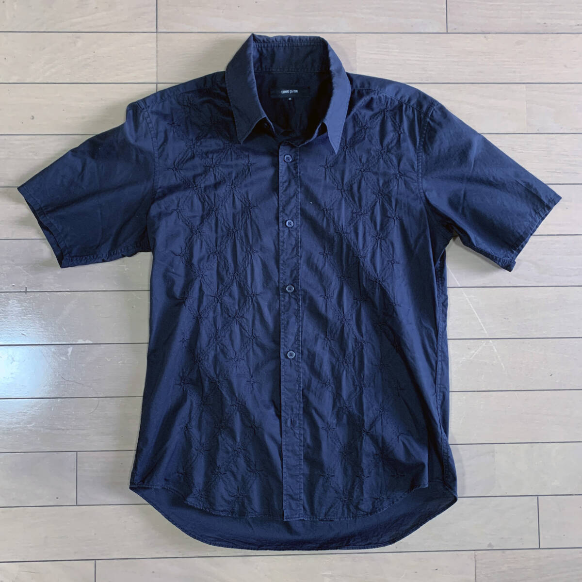 ブラックのCOMME CA ISMの刺繍入り半袖シャツ。通常の古着レベルです。 - ブランド: COMME CA ISM - 色: ブラック(画像4、5参照) - サイズ: M - デザイン: 刺繍入り - スタイル: 半袖 - 素材: 綿100% - 実測サイズ: 身幅48、身丈70、袖丈23、肩幅40(cm・直線計測)