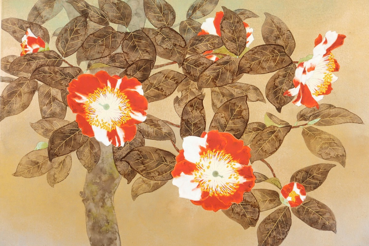 真作 霜鳥忍 日本画「長寿花」画寸 12号 大分県出身 日本美術院研究会員 松尾敏男に師事 斑入りの椿花 柔らかな色彩と繊細な筆致 11170