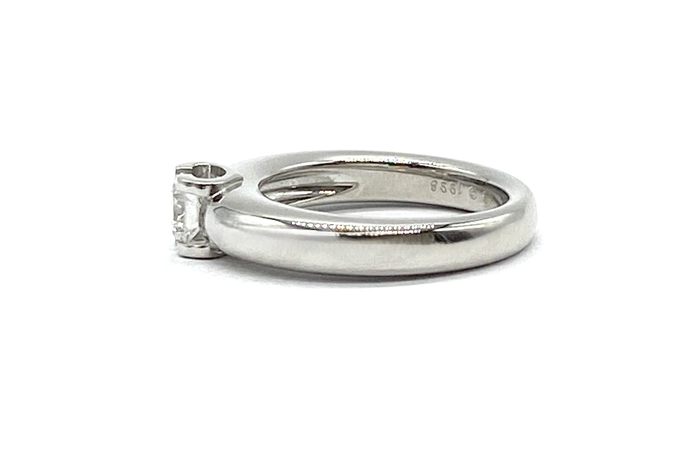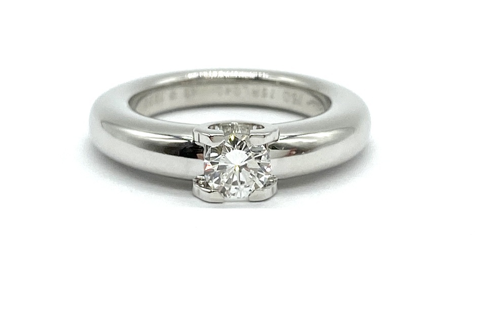 | 解説 | サイドから見ると、爪をブランドロゴの”C”で描いた、往年のC ドゥ ソリテール。発売当時0.3ct 0.4ct 0.5ctの3種の展開があった中、当品は推定0.4ctタイプ。たっぷり地金を投じたリッチなフォルムで、石目以上のダイヤの存在感を醸します。洗練されたエスプリをどうぞ! |