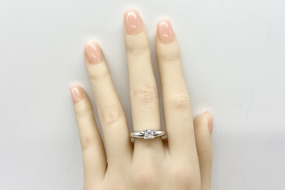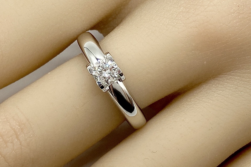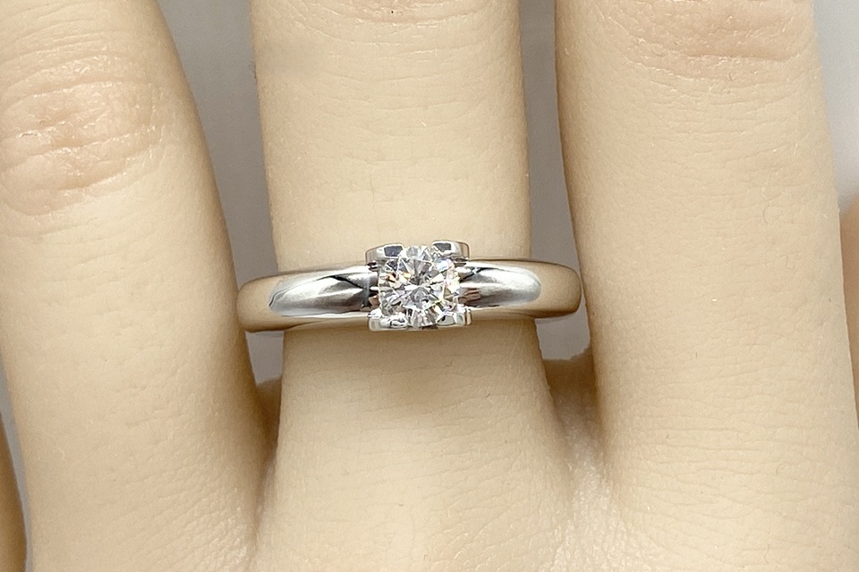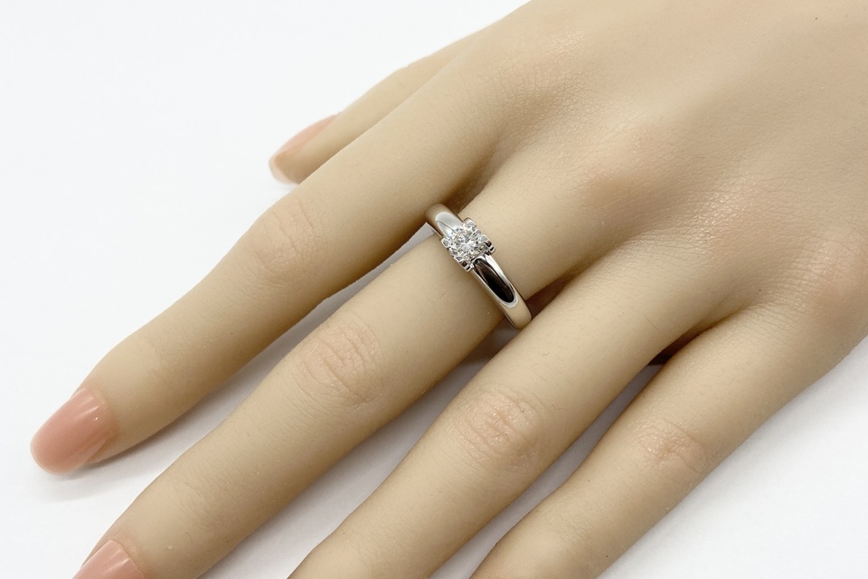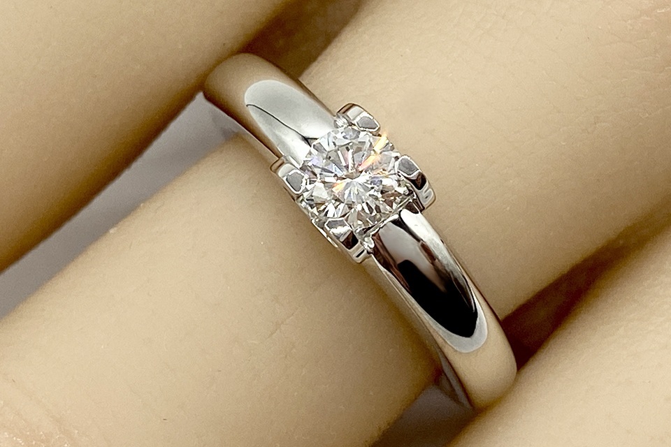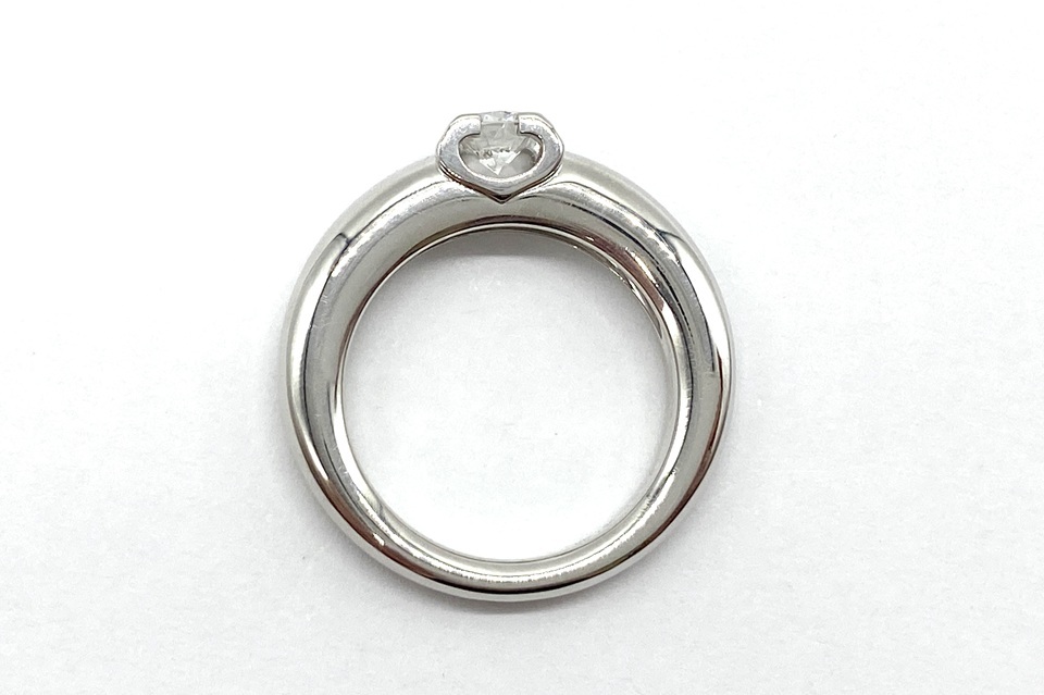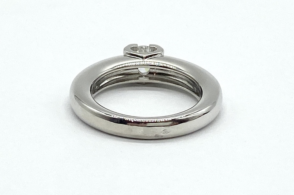 | 仕様 | 石目刻印なし(推定0.4ct G-VS以上) ♯9号(#49刻印有/サイズ直し不可) 主石直径 4.2mm 最大幅5.5mm 8.2g |
