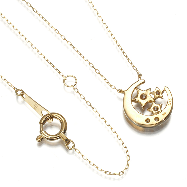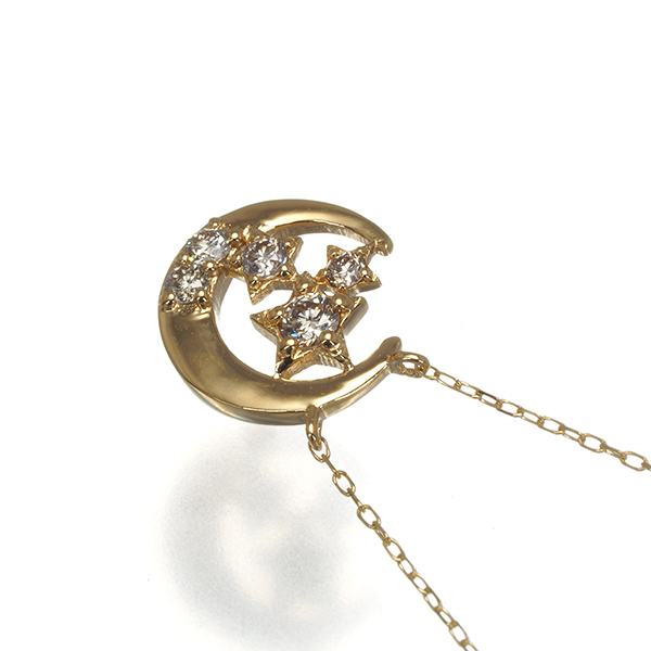 艶やかな光沢放つムーンデザインと共に3つのスターモチーフを飾ったデザインネックレス。石の上質な透明感を持つダイヤモンドの煌びやかな輝きと共に胸元を美しく照らしてくれるジュエリーです。 |