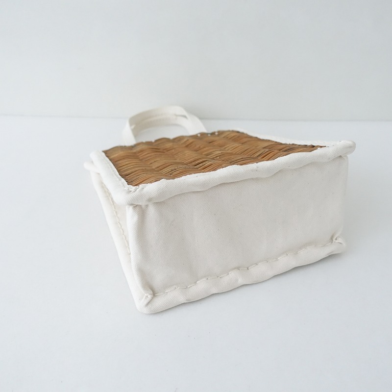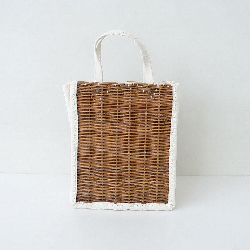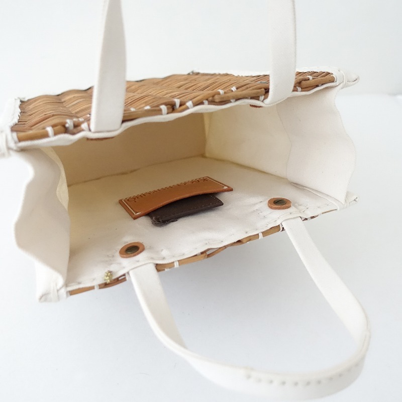 | ebagosのキャンバス・かご袋・ハンドです。カラーはナチュラルブラウン×生成りで、紅籐と綿100%の防水キャンバスであしらわれています。内側にはオープンポケットが1つあり、ミラーが付属しています。取り外し可能な底板付きです。 |