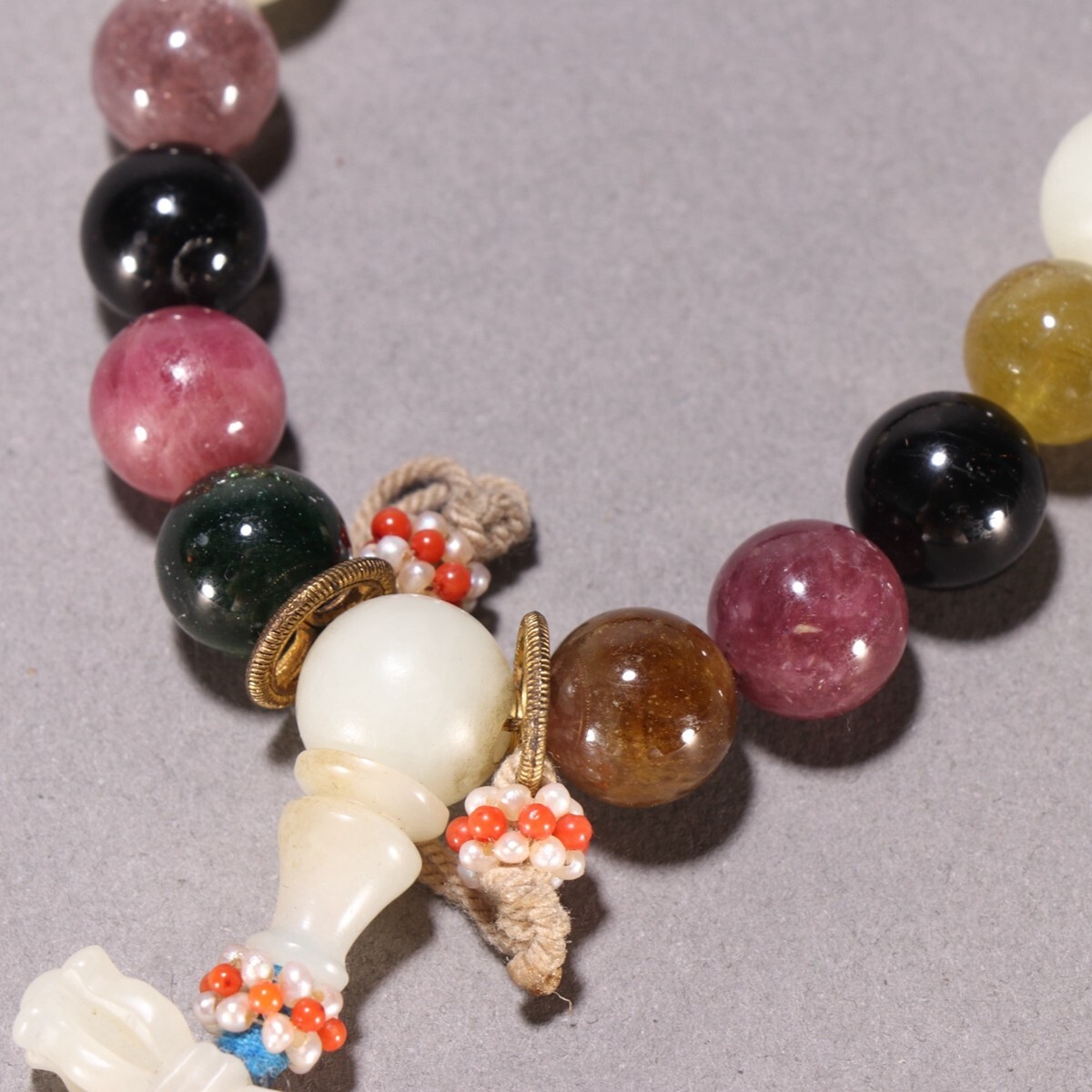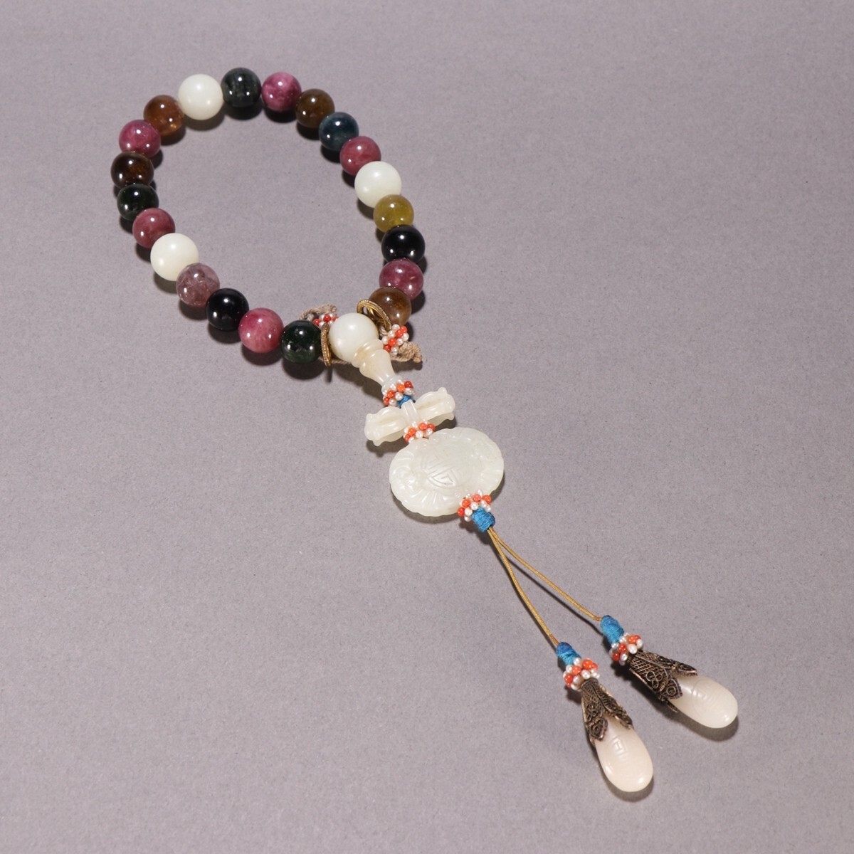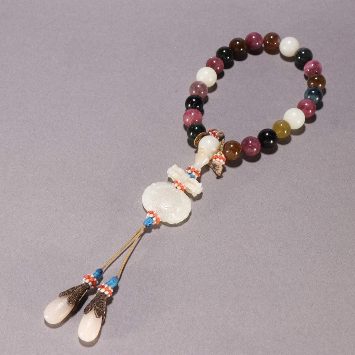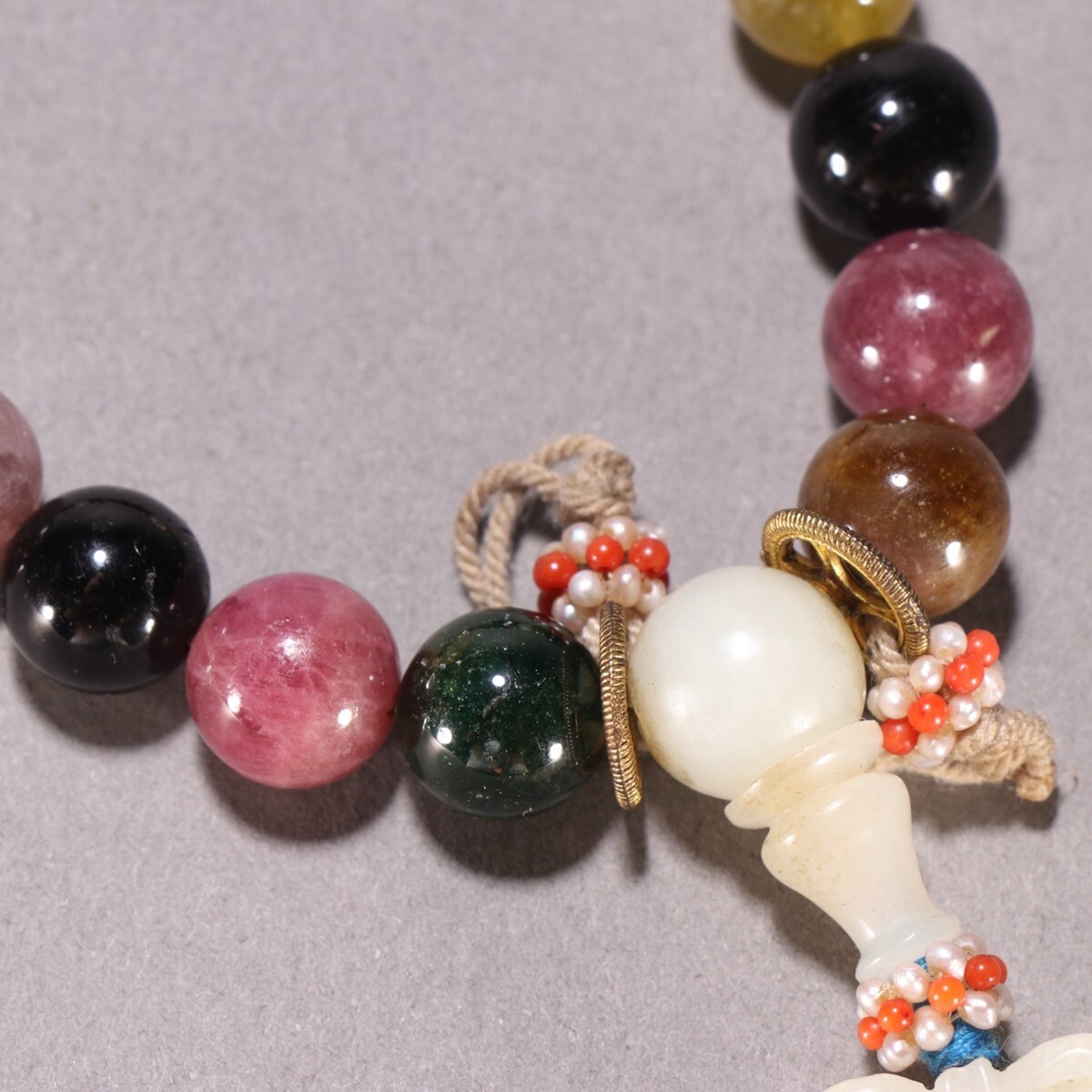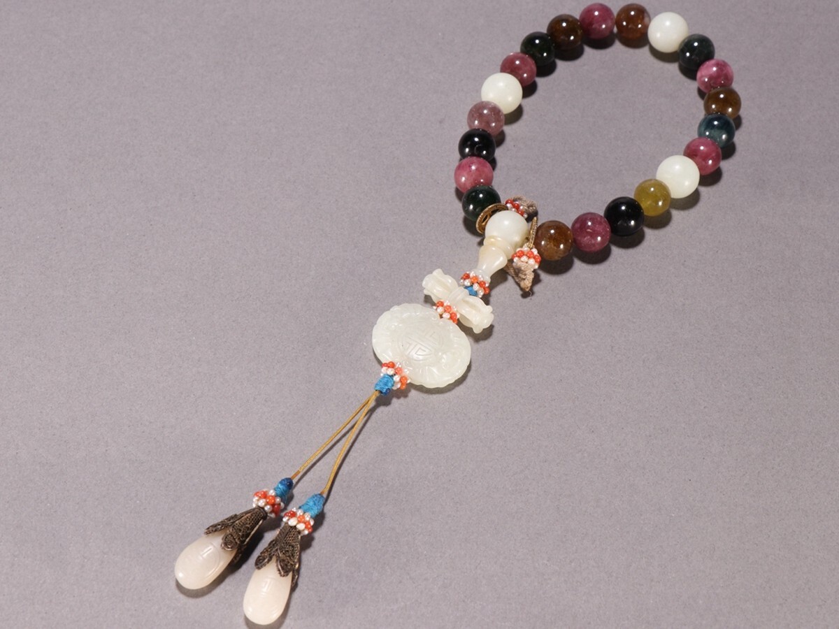 清時代 碧璽彫 十八子手持 和田玉隔珠【仁】極細工 手彫り 裝身具 古賞物 中国古美術 蔵出