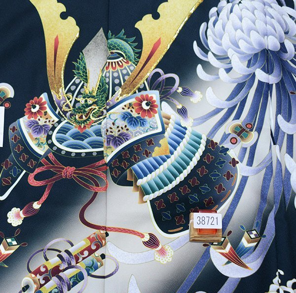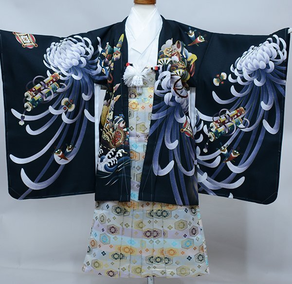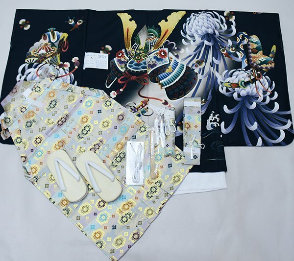 七五三 五歳 男児 羽織袴フルセット 着物 L寸 金刺繍 豪華絢爛 綸子地 黒地 兜 菊 お仕立て無料 袴変更可能 祝着 新品(株)安田屋 NO38721