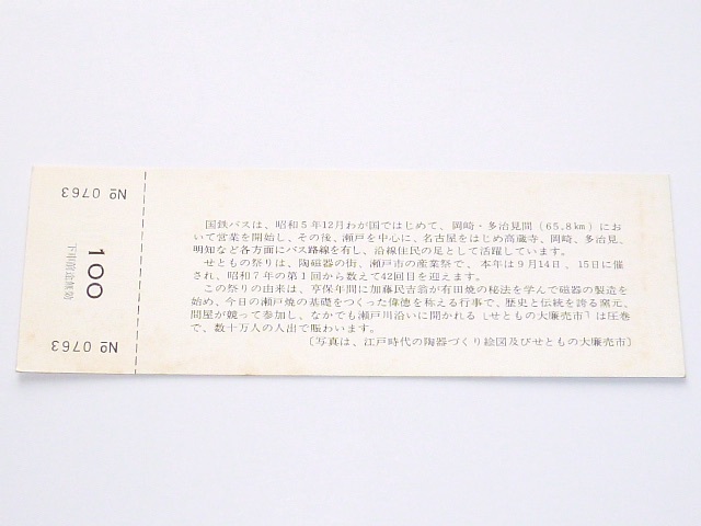 ※ 記念切符★中部地方国鉄バス沿線お祭りシリーズ乗車券No.4★せとものまつり★昭和50年9月15日★1枚★金沢駅発行★0763 ※