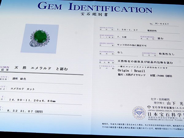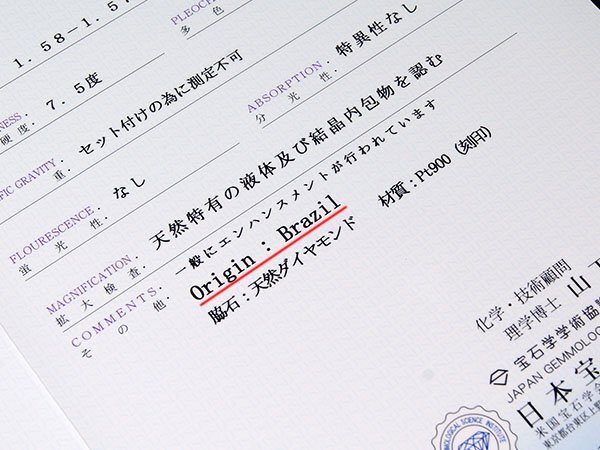 日本宝石科学協会発行の宝石鑑別書付属(産地記載有り)