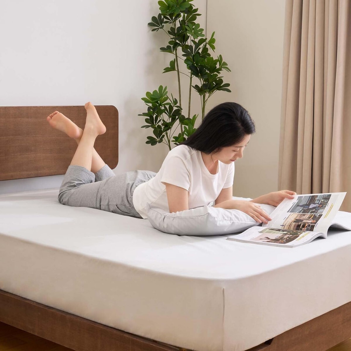 freely 綿ボトムシーツはオーガニックコットン マットレスカバー 100%の肌なじみ優しさと高密度織りで耐久性を両立し、30cm超厚マットレスを完全包み込む立体裁断が睡眠中のずれ動きをゼロに抑制。洗濯機40回試験で証明された縮み・色落ち耐性が毎日の手間を削減、防ダニ加工がアレルギー家族の365日清潔睡眠を守ります。