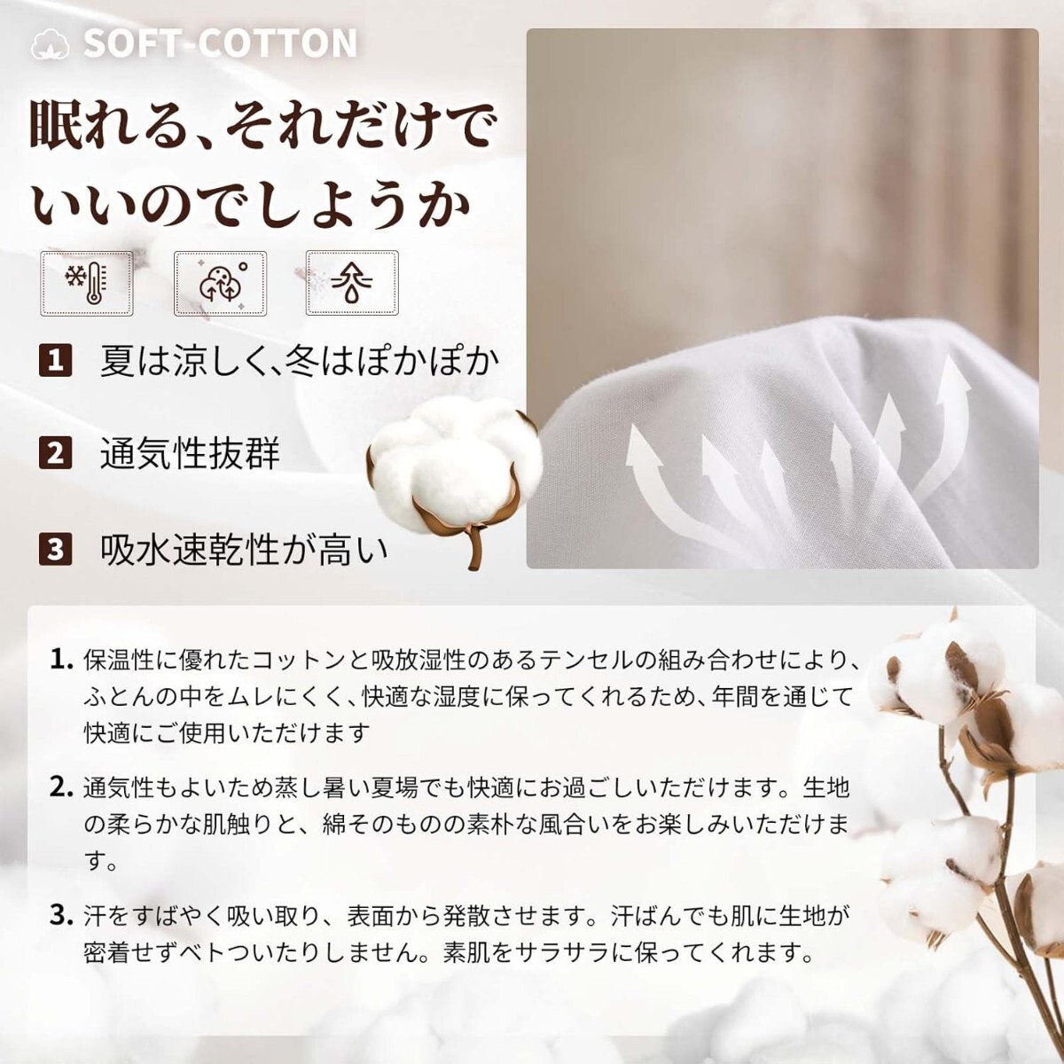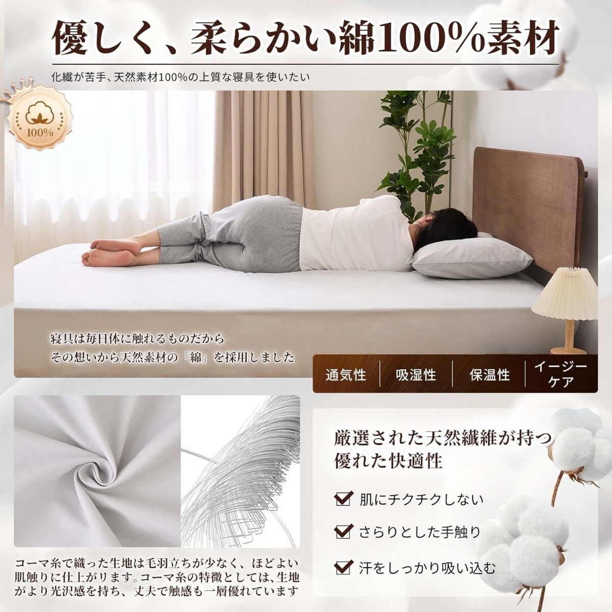 freely 綿ボトムシーツは 布団カバー 高密度オーガニックコットン100%製で肌ストレスフリーの柔軟触感を実現。30cm超厚マットレスを完全包み込む360度ストレッチ設計と四隅強化ゴムバンドで睡眠中のずれ・シワを根絶。吸湿発熱機能が冬の冷えを防止し、立体透かし編み構造が夏の蒸れを解消。洗濯機40回試験済みの耐久性で縮み・色落ち・毛玉形成ゼロ、防ダニ加工がアレルギー体質の家族を365日守り、自然配色で高級感あり!