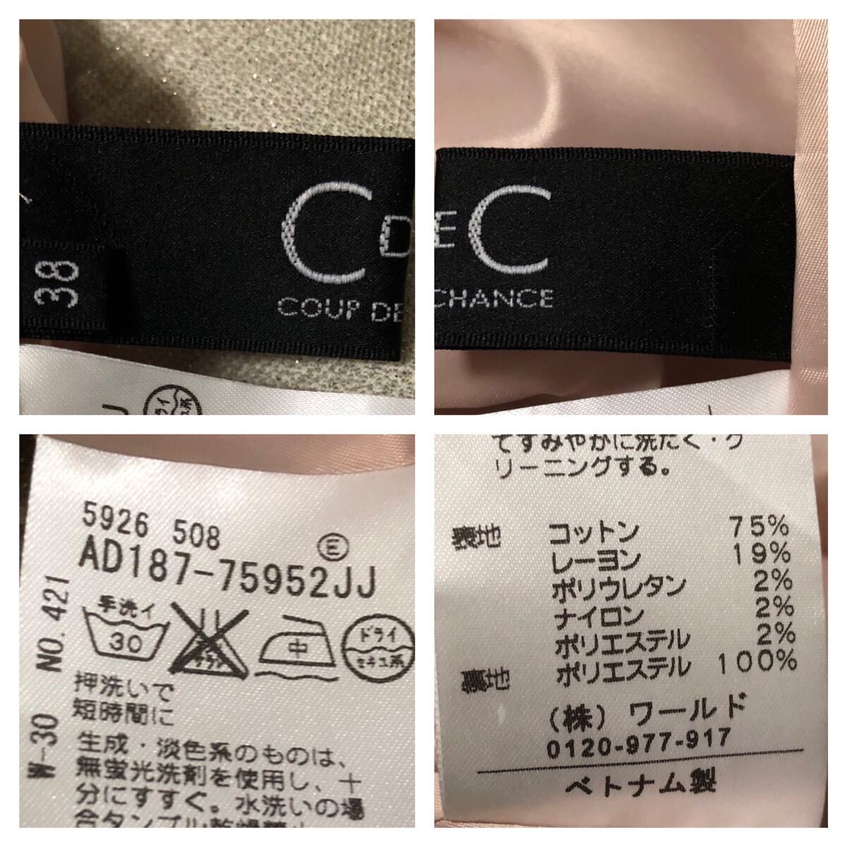 ◆素材・・・表地 コットン75% レーヨン19% ポリウレタン2% ナイロン2% ポリエステル2% . 裏地 ポリエステル100%
