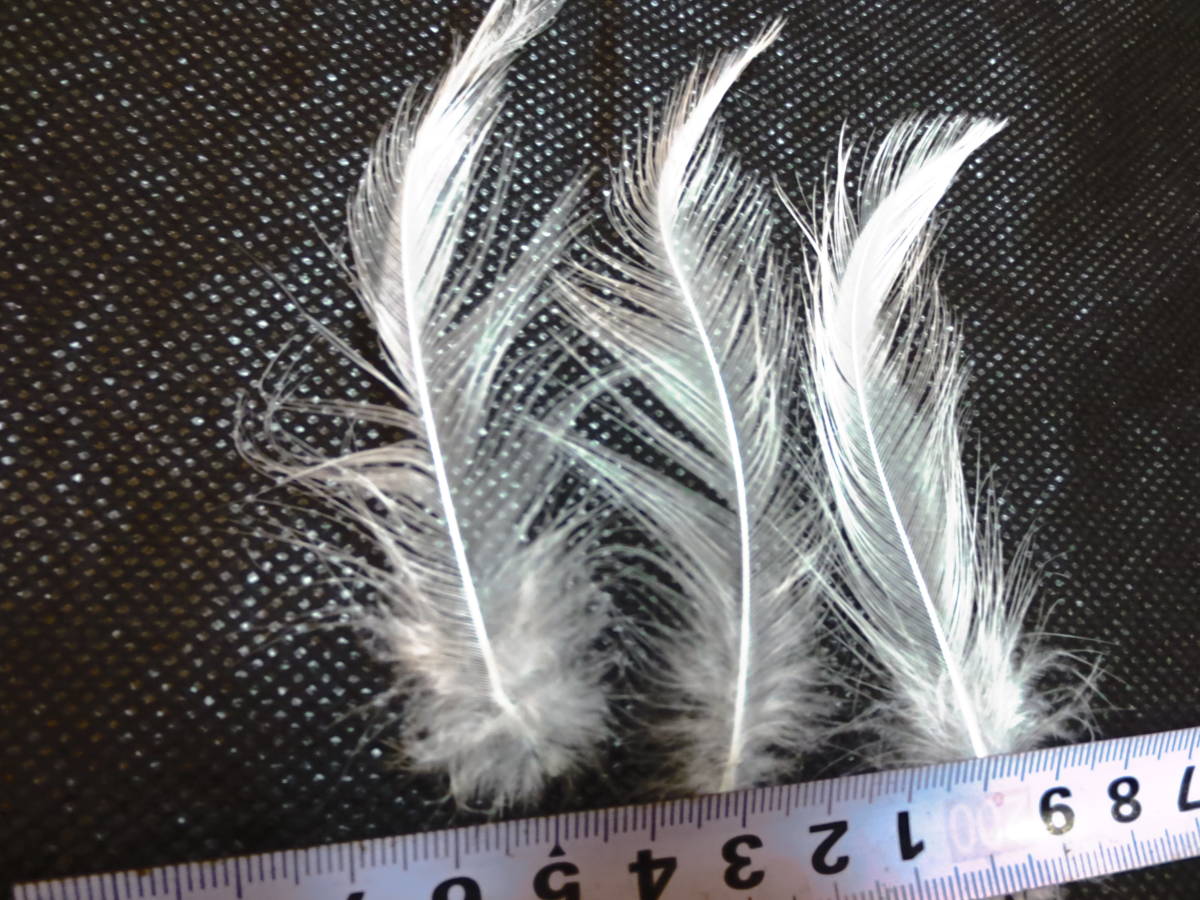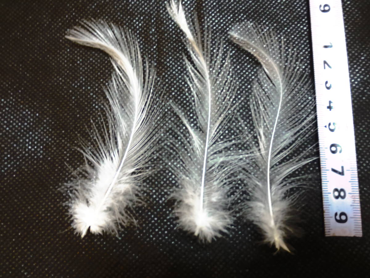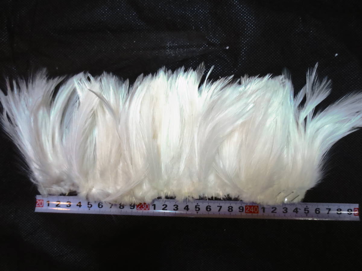お客様の手元にお届けになるのは、写真とほぼ同じ色と同じサイズの同等品で、20cm長さの羽毛の帯/羽の本数は約100本以上/目方は約10gぐらいです。 |