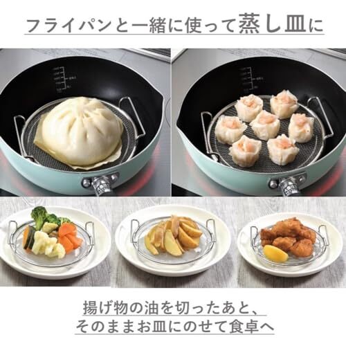 製品サイズ:(約)幅17×奥行16.5×高さ3.5cm 製品重量:(約)0.1kg 素材・材質:ステンレス鋼 生産国:中国 ※20cm以上のフライパンに対応 フライパンと一緒に使って蒸し皿に! 蒸し皿としても、油切りとしても使えます。 揚げ物の油を切ったあと、そのままお皿にのせて食卓へ! ご注意:20cm以上のフライパンに対応しております。