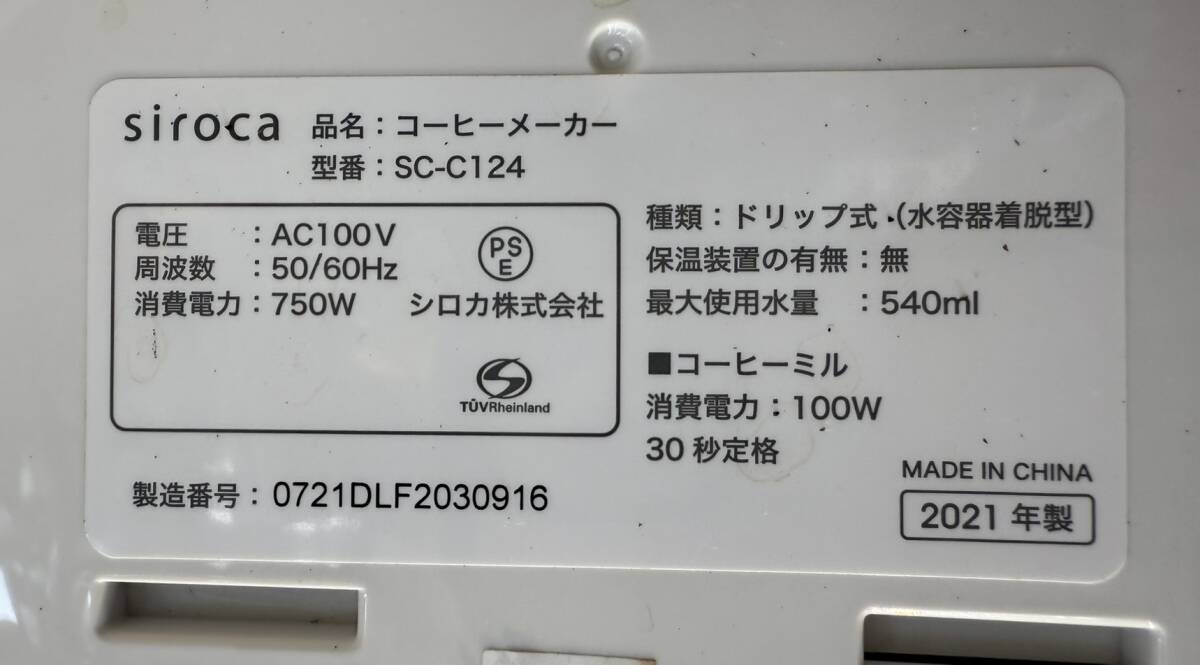 送料無料S95828 siroca シロカ コーン式全自動コーヒーメーカー SC-C124 2021年製 良品 中古品になります。 動作確認済みです。 画像にある物が全てとなります。 新品、未使用品ではございませんので、画像では分かりにくい小キズや汚れ等ある場合がございます。 中古品に付きトラブル防止の為、神経質な方や完璧を求める方は御遠慮下さいますよう、御願い申し上げます。 | ||