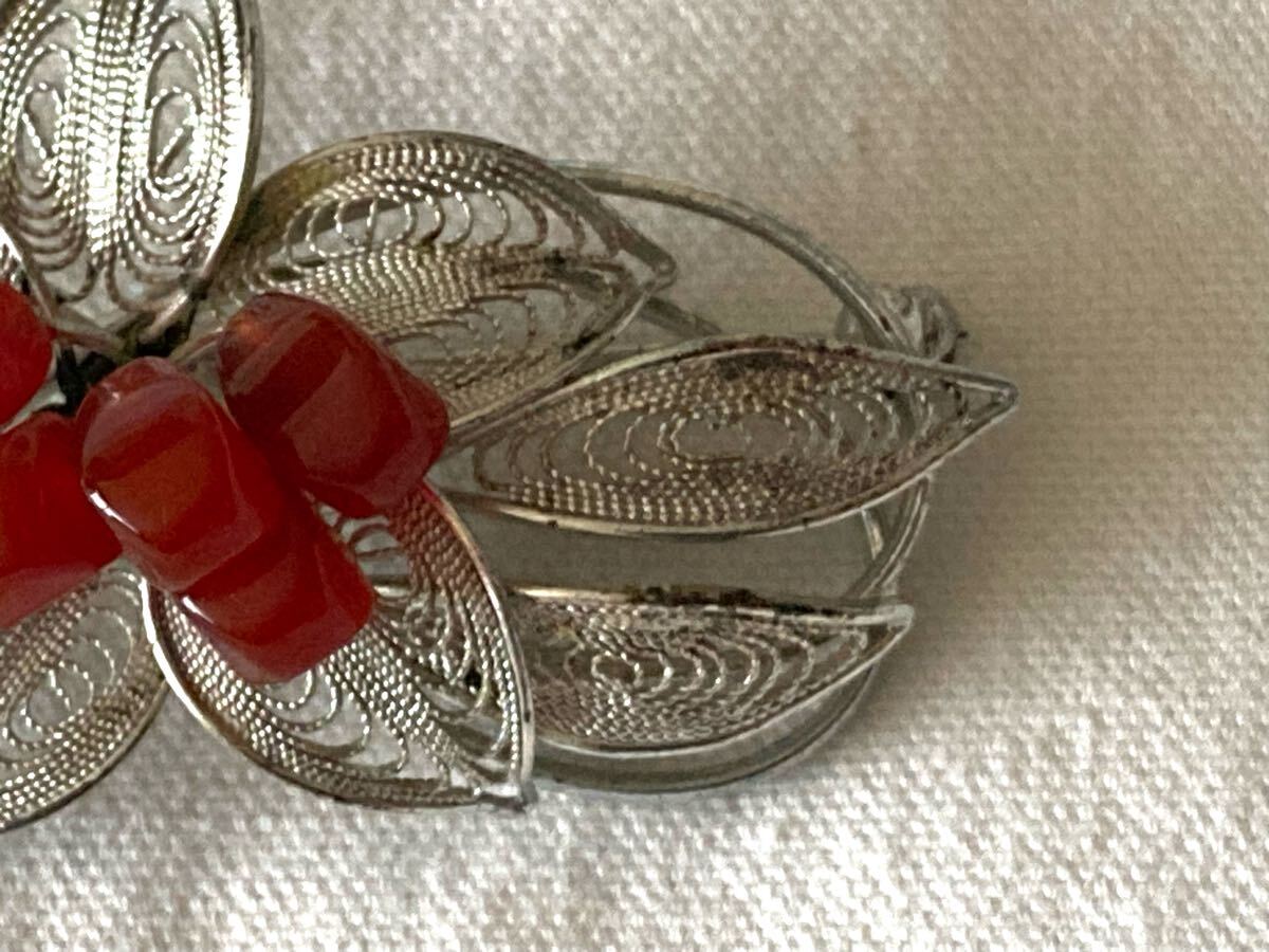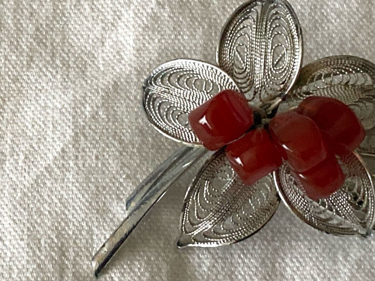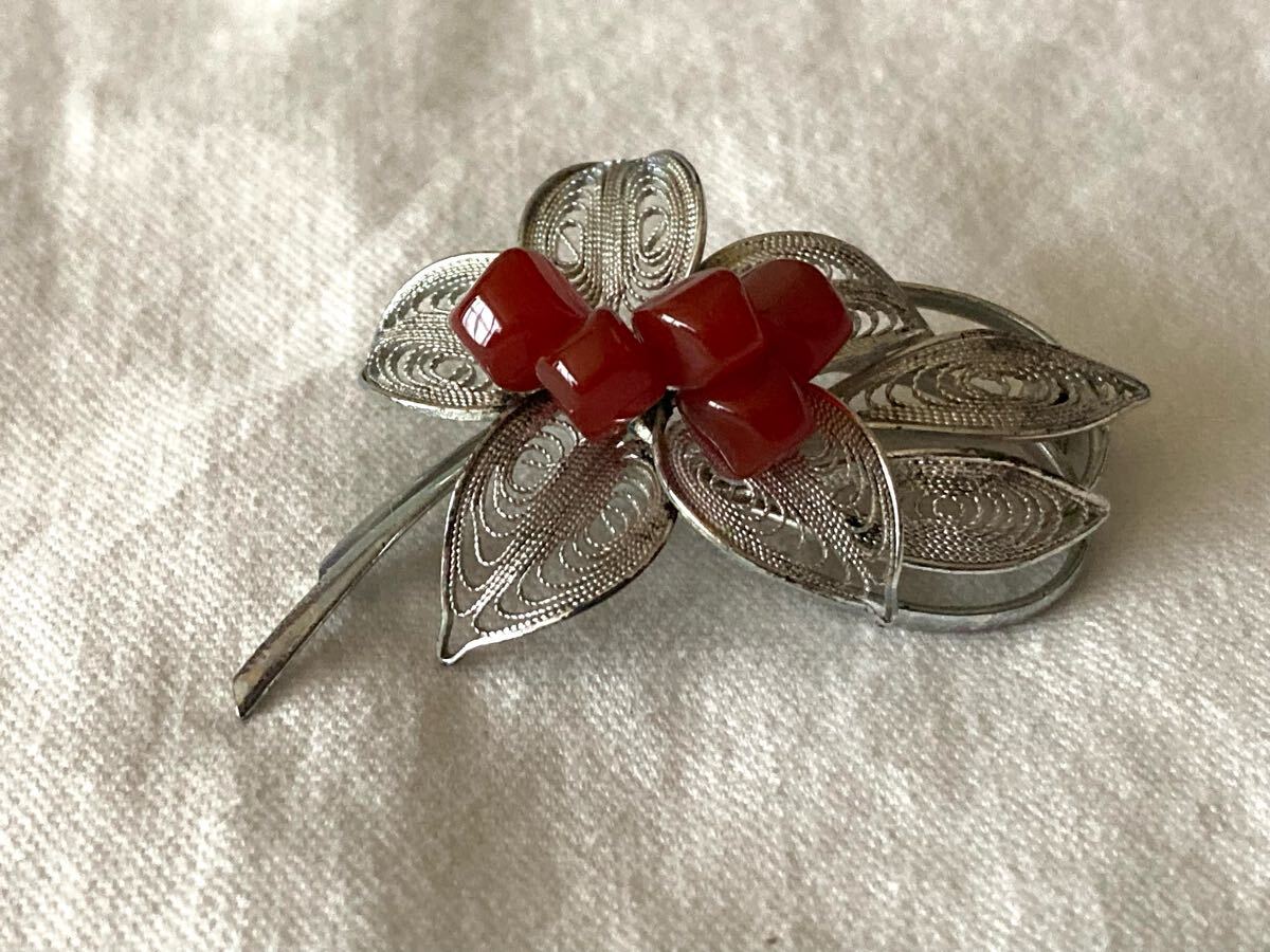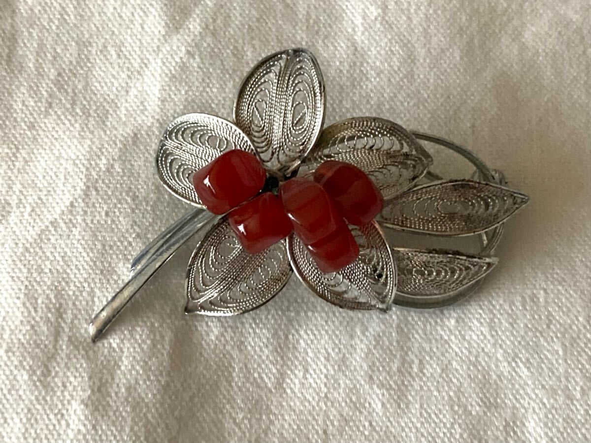 シルバー製の花形ブローチに赤いビーズがあしらわれたエレガントなデザイン。