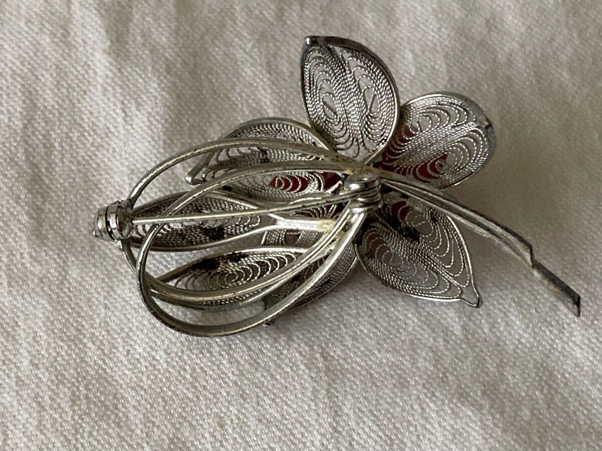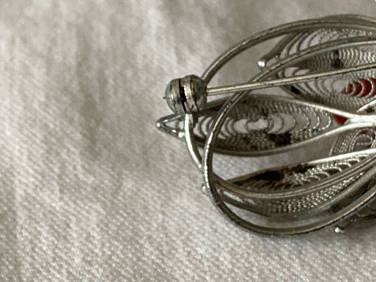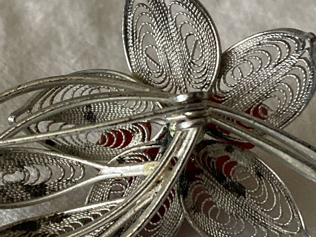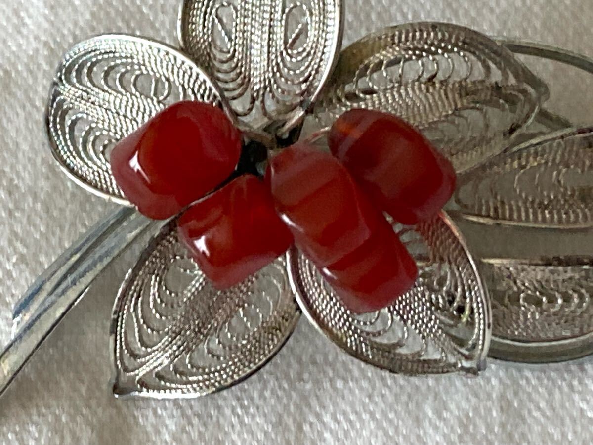 シルバー製の花形ブローチに赤いビーズがあしらわれたエレガントなデザイン。