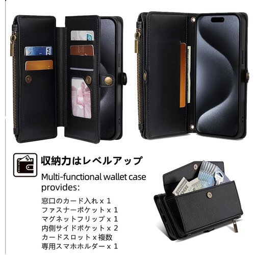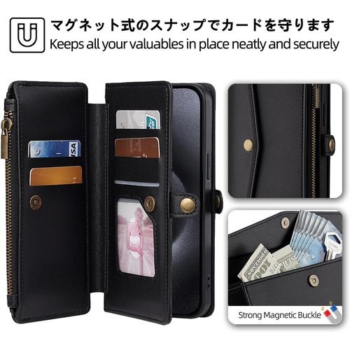 【特徴4:カード収納と安全保護】カードスロットやサイドポケットも数多く装備しております。ちょっとした外出する際に、財布が無しでもショルダーケースだけで十分です。内蔵マグネットのスナップなのでピタッと閉まります、数枚のカードを入れてもフラフラすることはありません。フリップの側面にファスナー型のポケットも設置しておきます、小銭やお鍵などの小物を収納することができます。