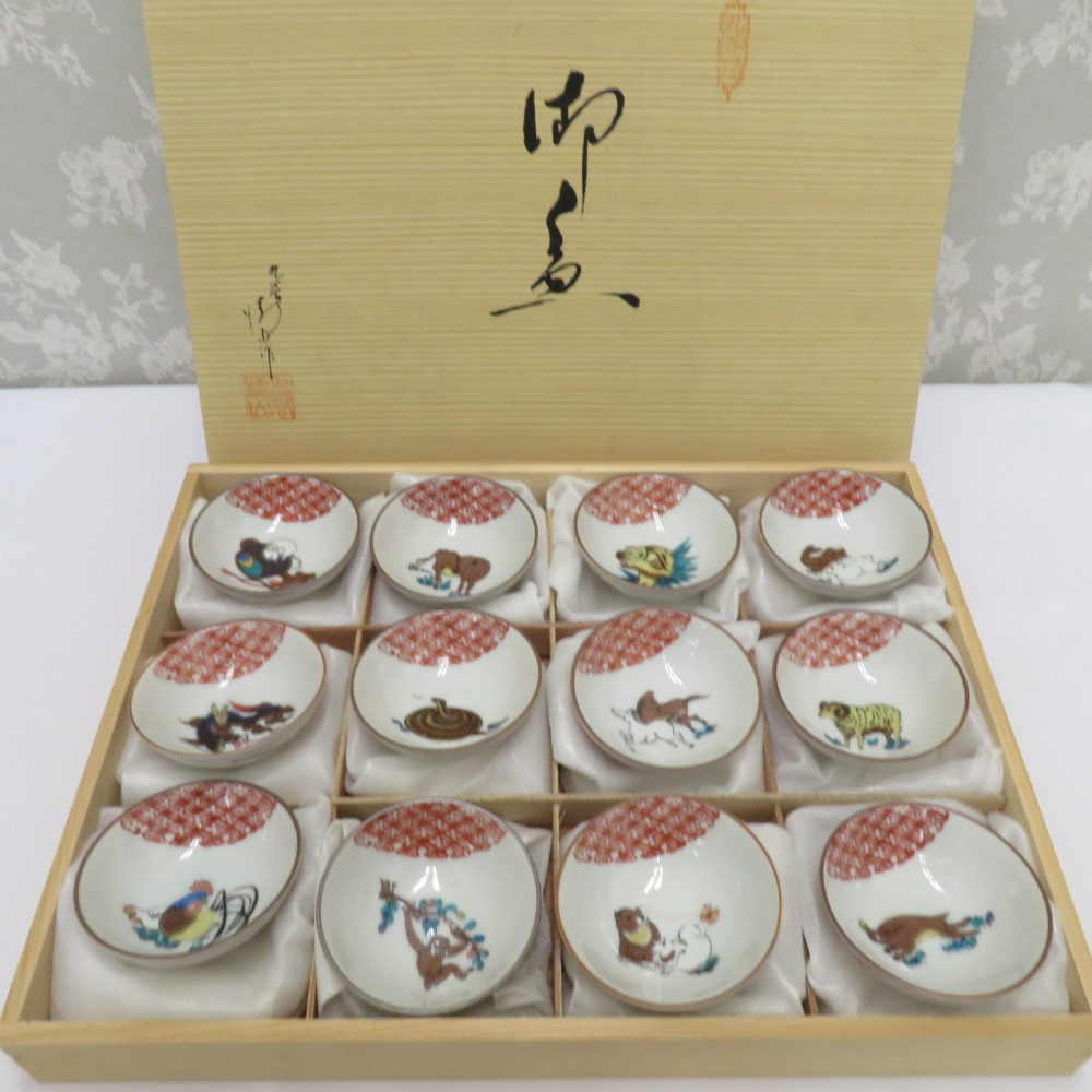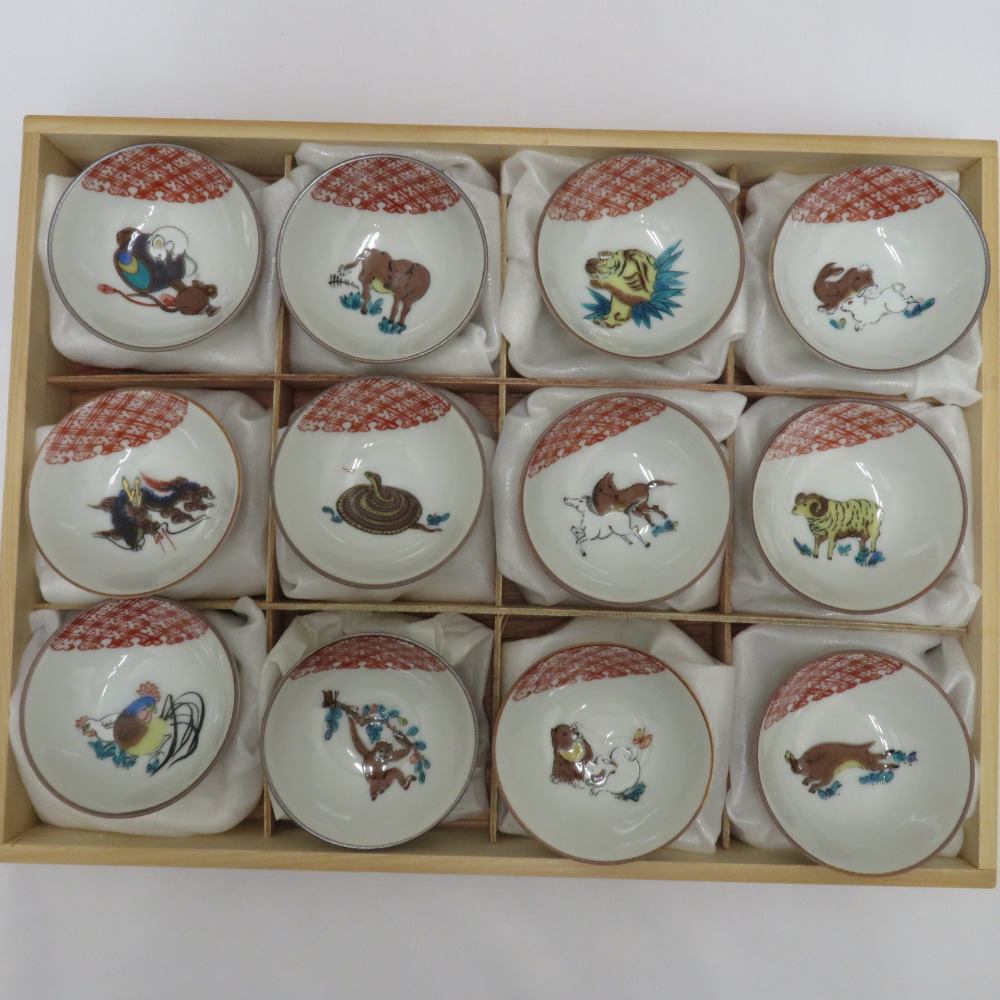 九谷焼 骨董・民芸品 情山 十二支盃 酒器 酒盃 お猪口 おちょこ 12客組 干支 絵変り 箱有