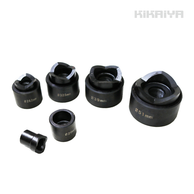 | 薄鋼用ダイス5個1セット内容 | ・サイズ/穴径 19/20mm、25/26.2mm、31/32.5mm、39/39mm、51/51mm |