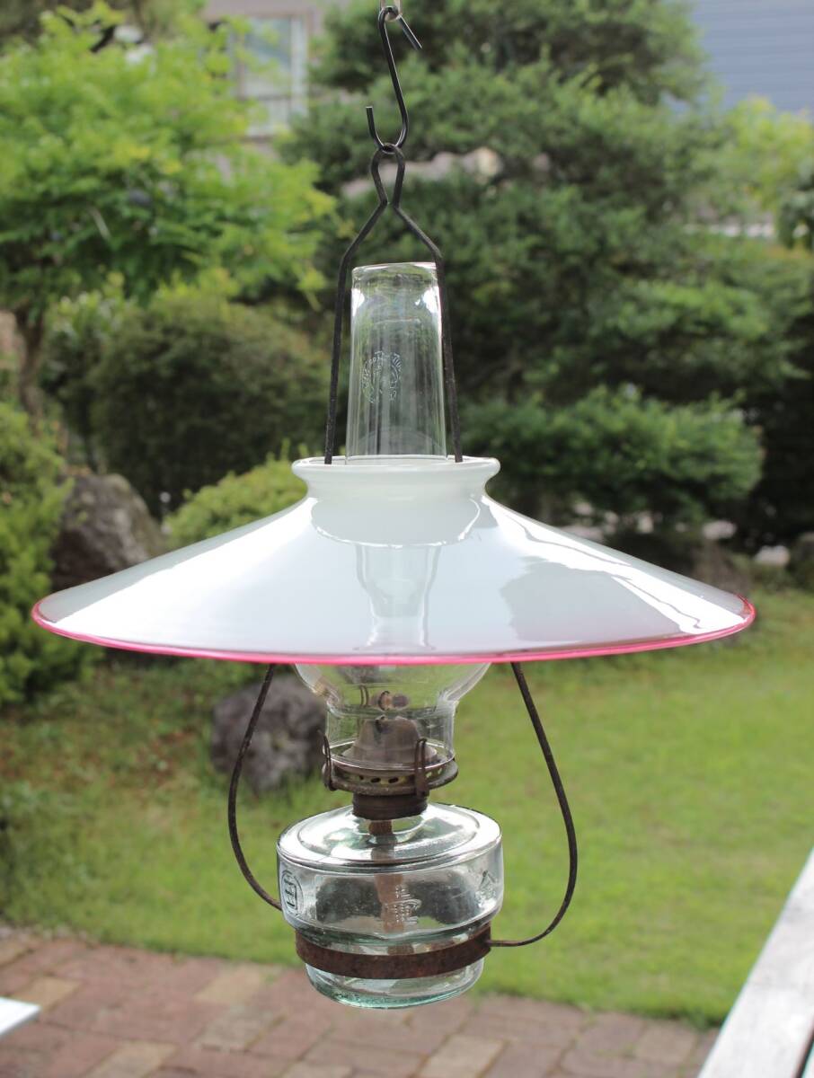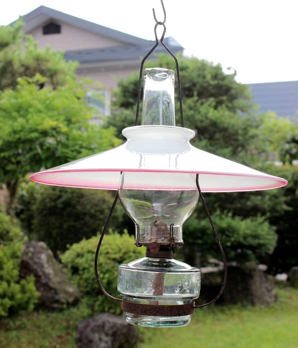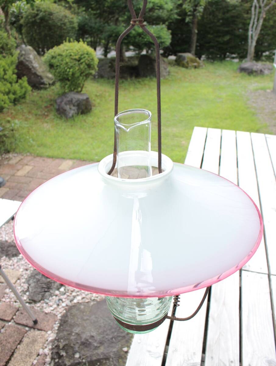 アンティーク オイルランプ 吊下げランプ 吊りランプ 乳白 縁赤 ガラス 電笠 〇ヨ式改良安全壷 エンボス 刻印有り